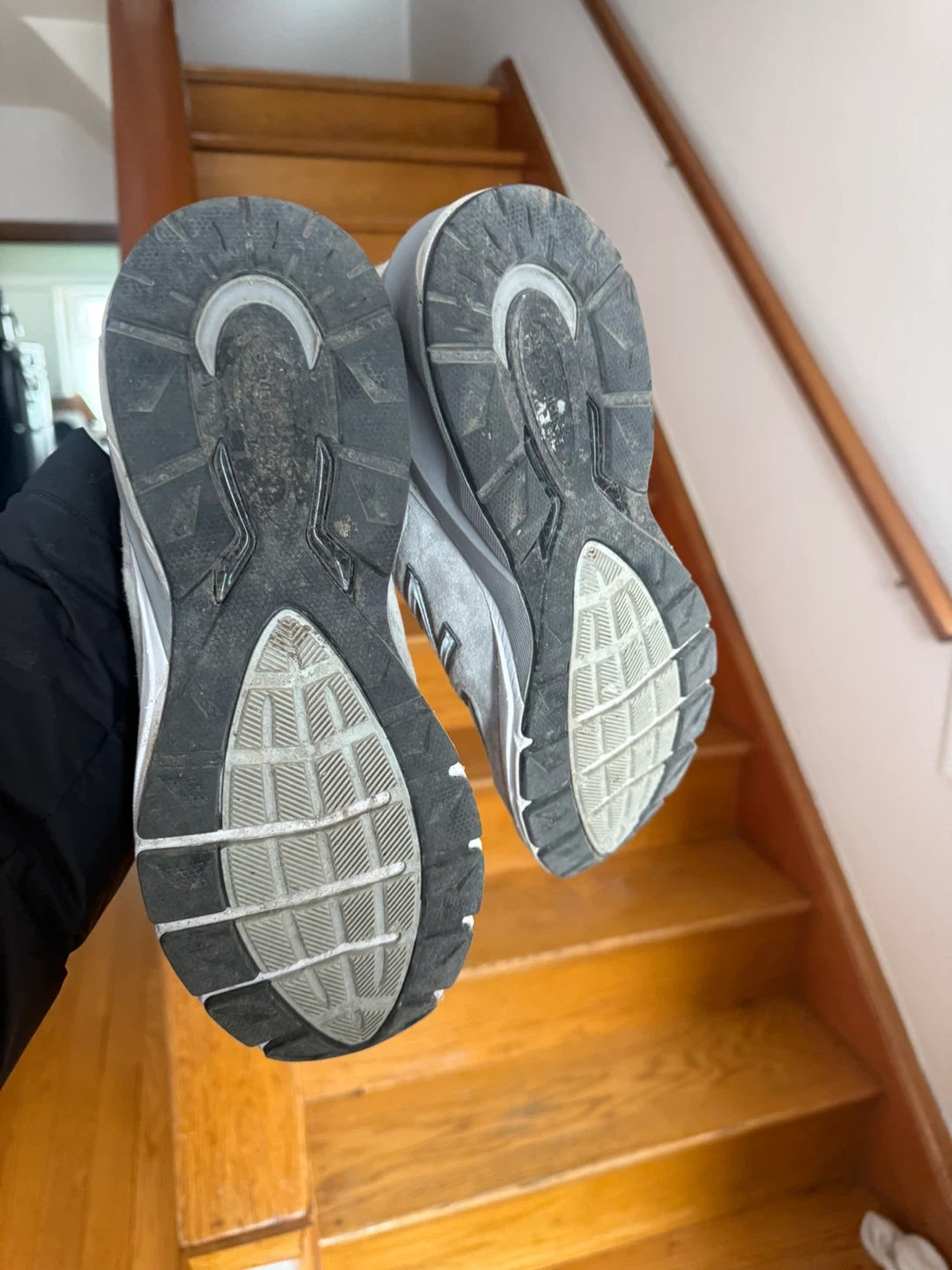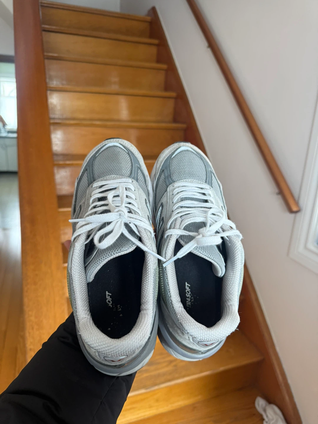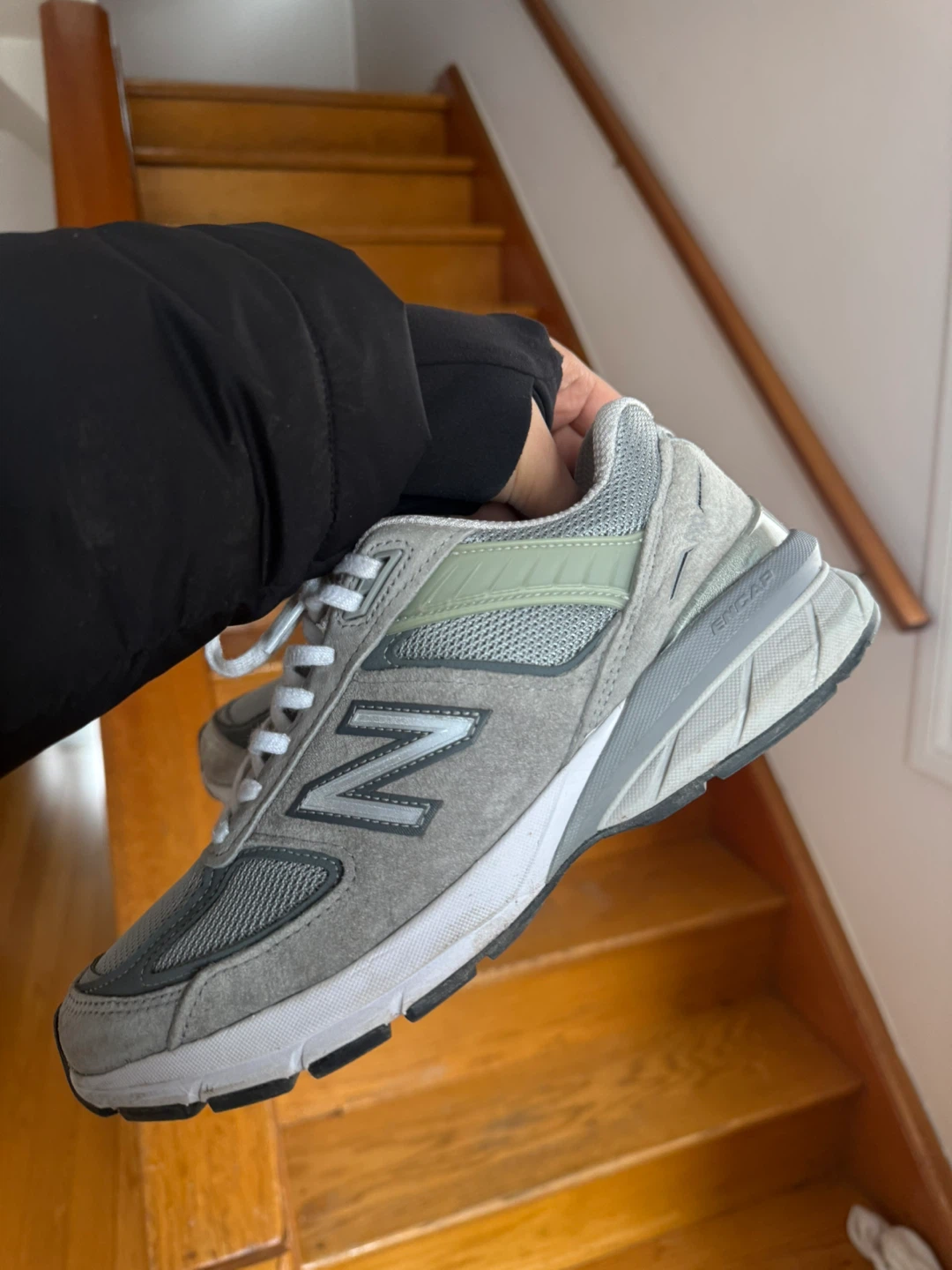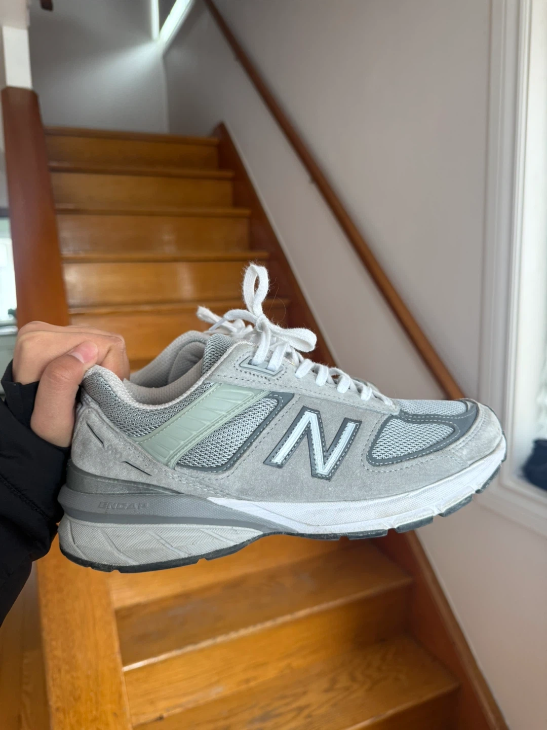 Grey New Balance 990v5 running shoes. Suede and mesh upper with ENCAP midsole technology. These are great for everyday wear or light running.