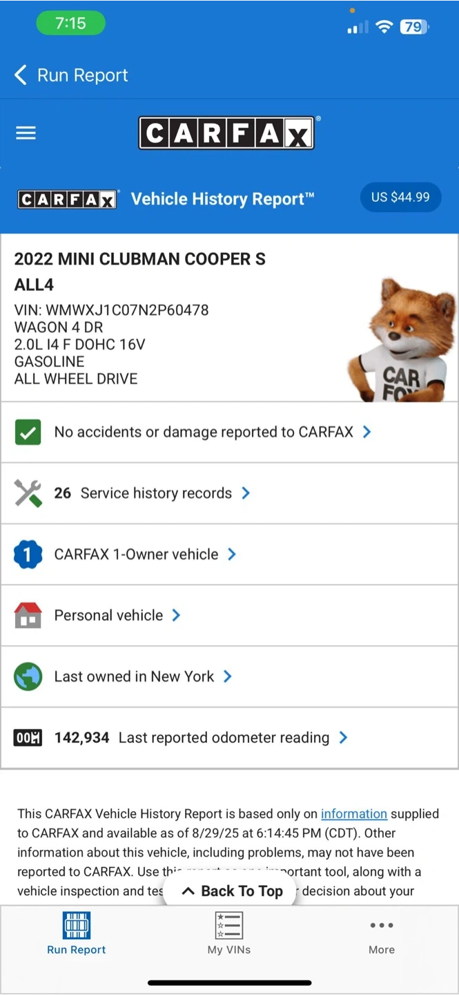 Selling a 2022 Mini Cooper S Clubman ALL4 in a vibrant blue color. It's a wagon with 4 doors and an all-wheel drive system. The engine is a 2.0L I4 F DOHC 16V gasoline engine. The Carfax report shows no accidents or damage reported and 26 service history records. It's a 1-owner vehicle, last owned in New York. The odometer reading is 142,934.price $14000