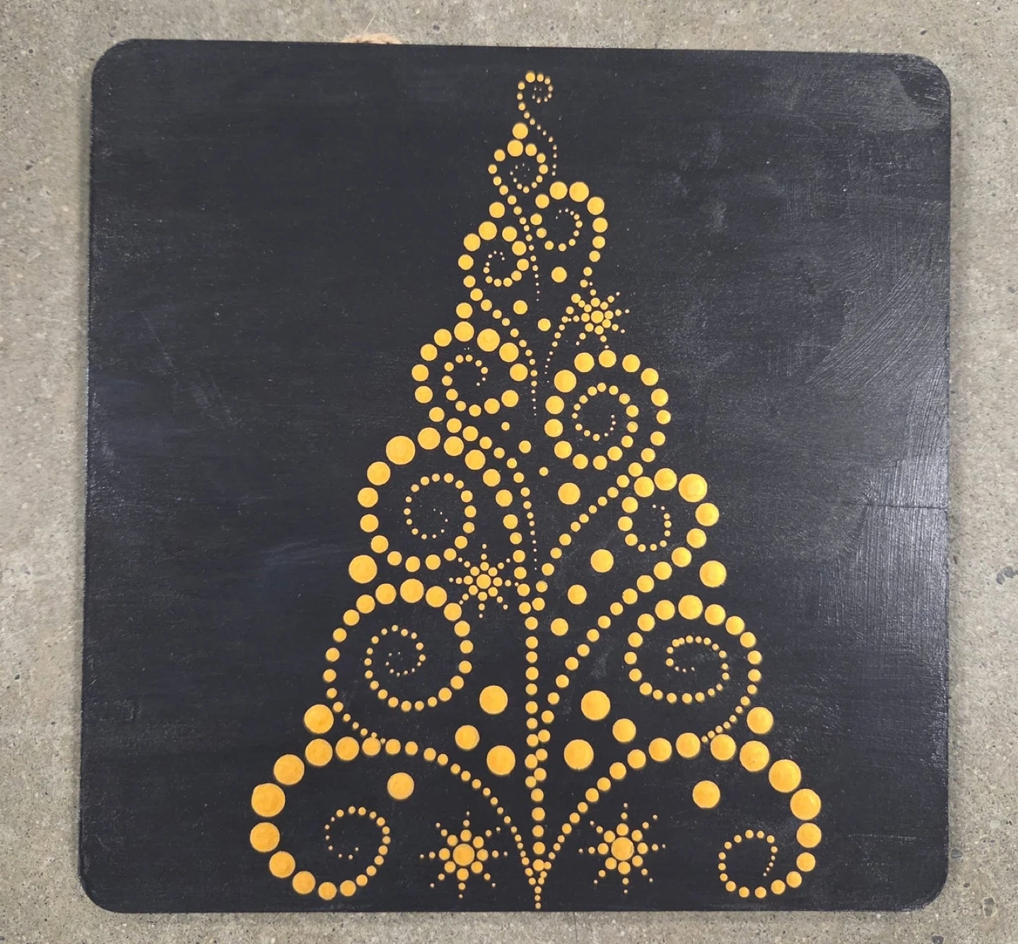 A unique hand-painted Christmas tree decoration! This piece features a black background with a golden dotted Christmas tree design. Perfect for adding a touch of handmade charm to your holiday decor