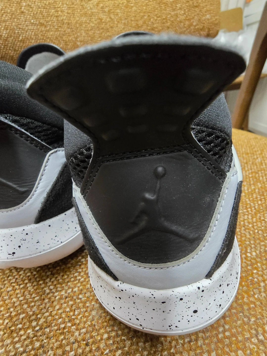 These grey and black Air Jordan shoes are perfect for athletic activities. They feature a durable rubber sole and a comfortable textile upper. These sneakers offer excellent support for your feet.