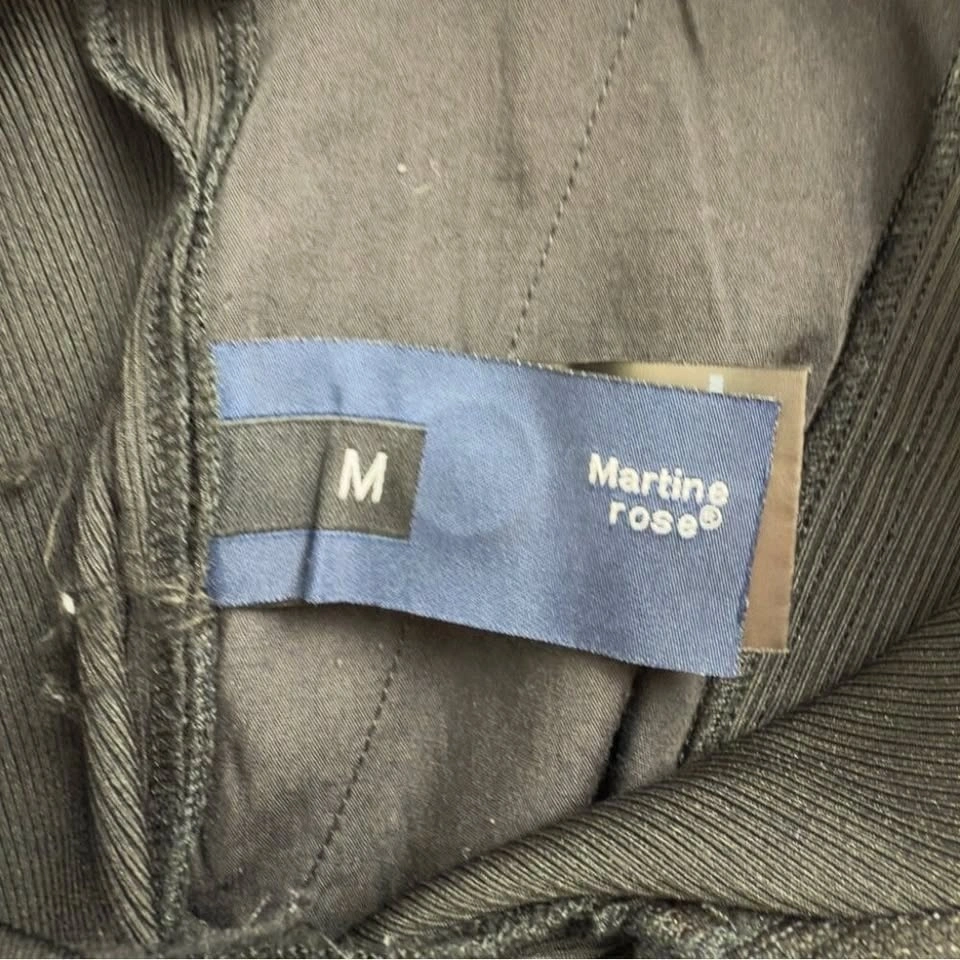Martine Rose Spira Zipped Pants in black, men's size medium, in good pre-owned condition. There is one stain on the right front leg, as shown in the photos. The model is 6 ft 1 in / 1.85m and wears a size medium. Material: 86% Polyamide, 14% Elastane. Made in Italy. Measurements: Waist: 15.5", Length/Outseam: 41.5", Rise: 10.5", Inseam: 32", Hips: 20.5", Leg Opening: 9". Size: 31 Waist x 32 Length. Color: Black. Brand: Martine Rose. See photos for reference. All offers are welcome!