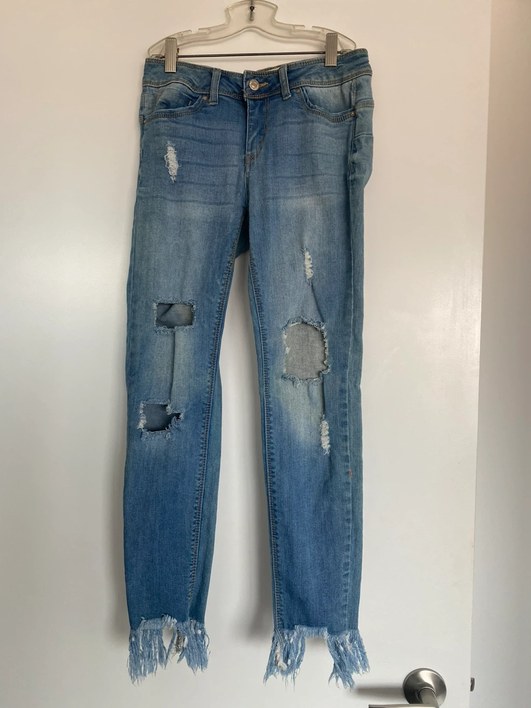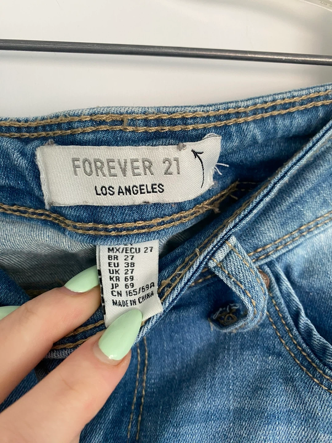 These are Forever 21 blue denim jeans with a distressed look and frayed hems. They're a size 27 in US sizing. Perfect for casual wear!