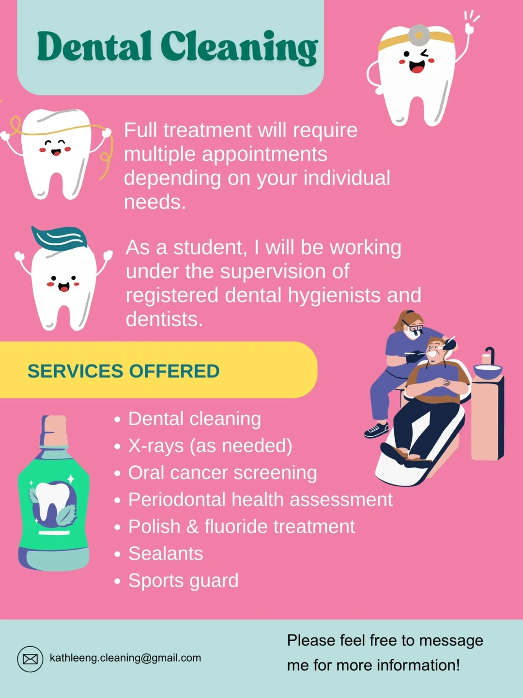 I’m Kathleen, a dental hygiene student, and I’m currently looking for patients who need a teeth cleaning! 🦷💫