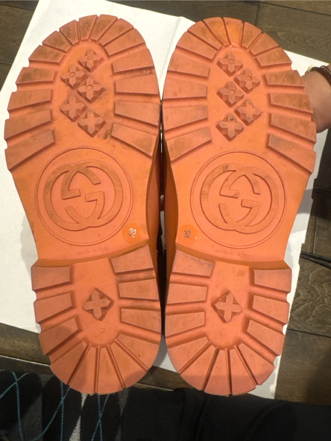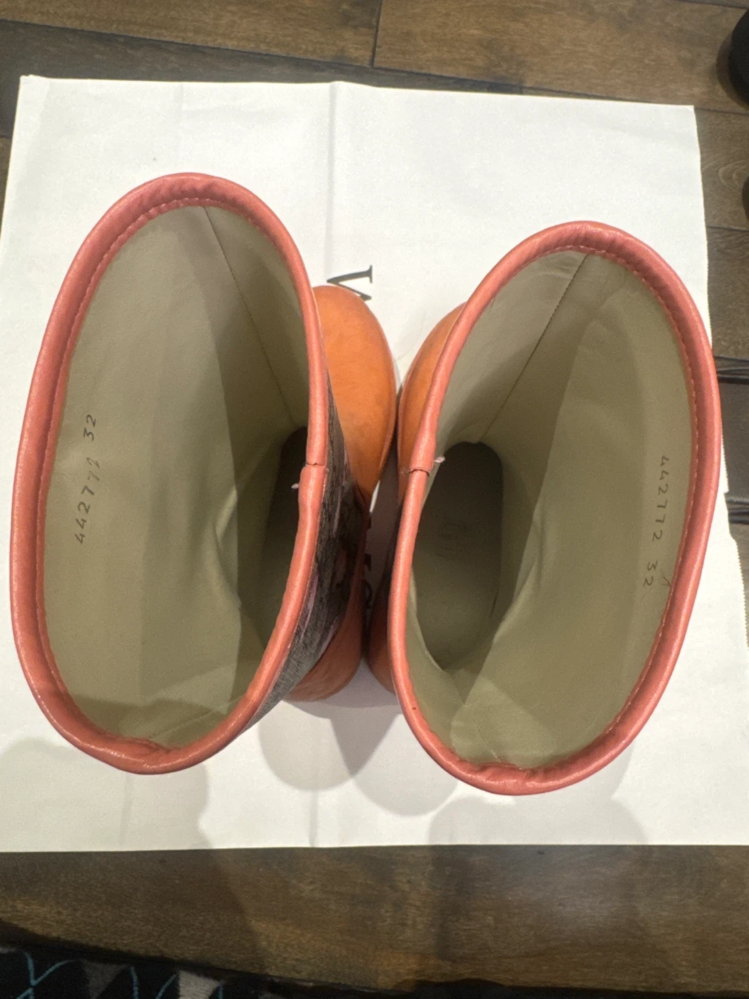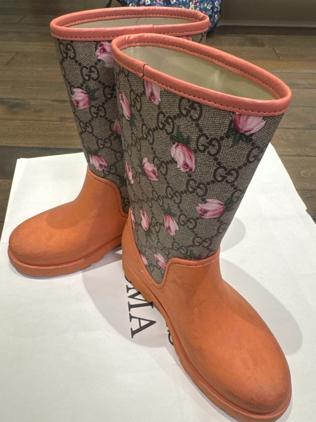 Gucci rubber rain boots in orange with GG Supreme canvas and tulip print.