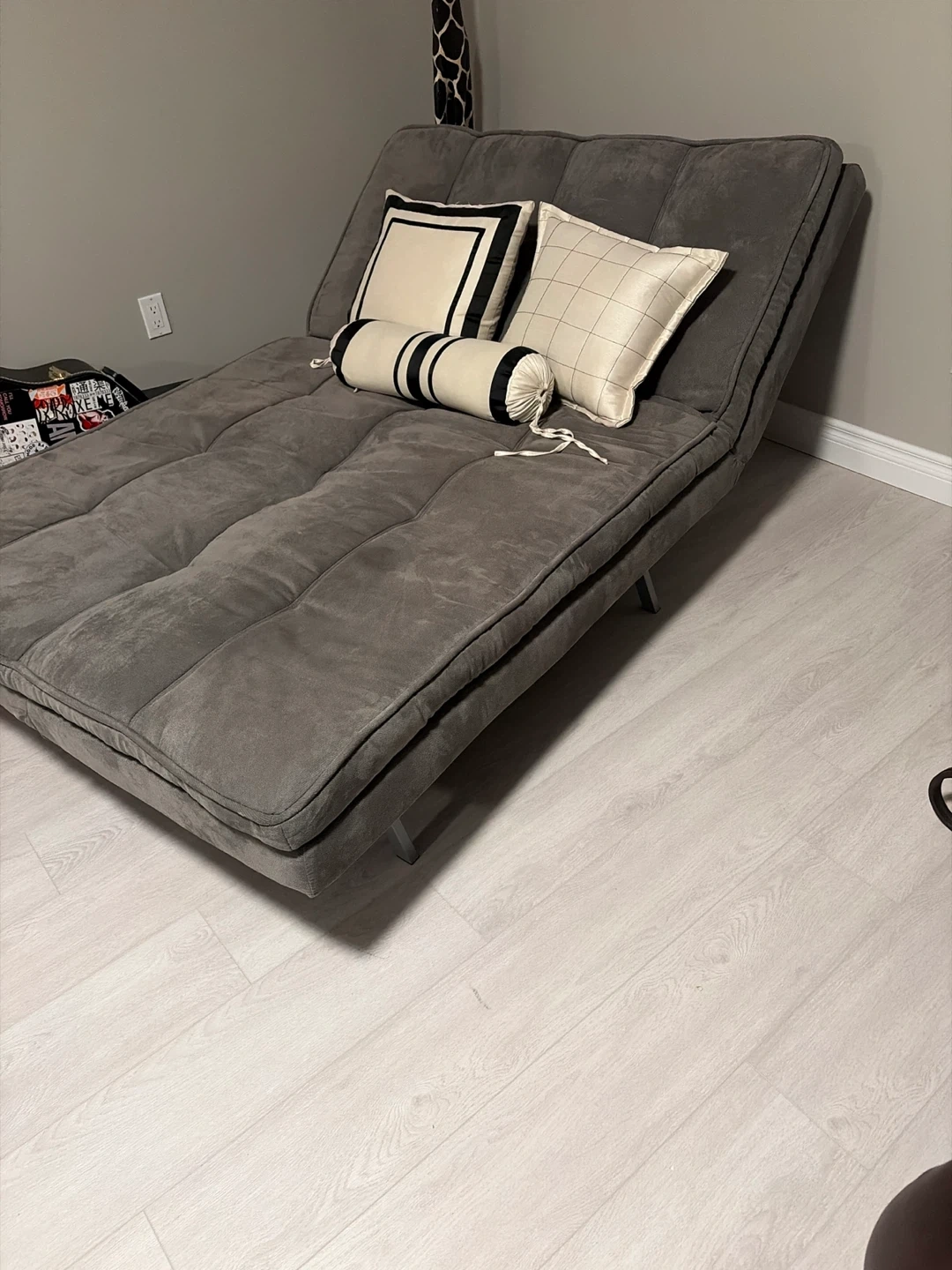 This is a versatile grey chaise lounge that easily converts into a sofa bed. It's upholstered in a soft fabric and includes decorative pillows. Perfect for small spaces needing extra seating or sleeping options!