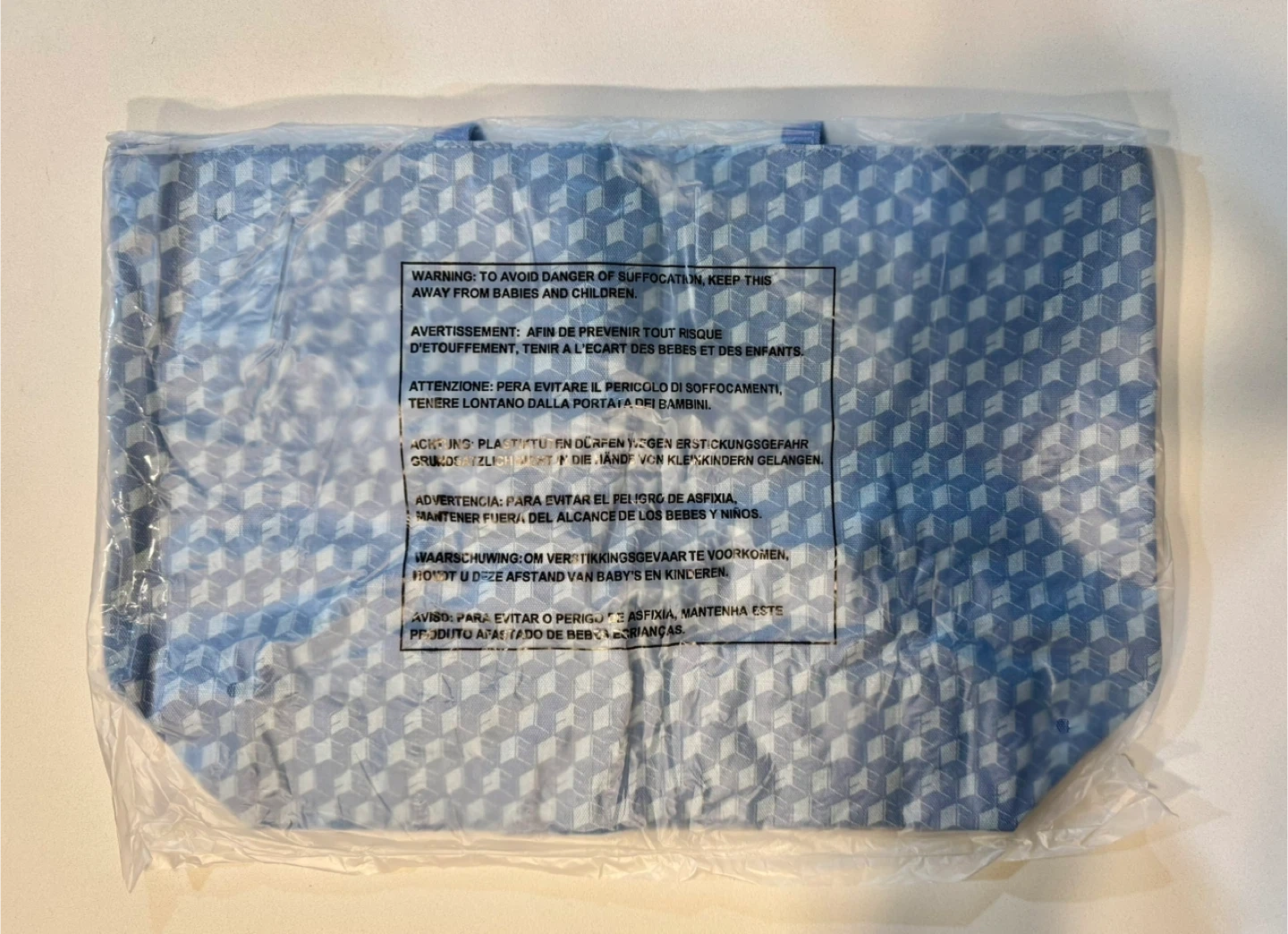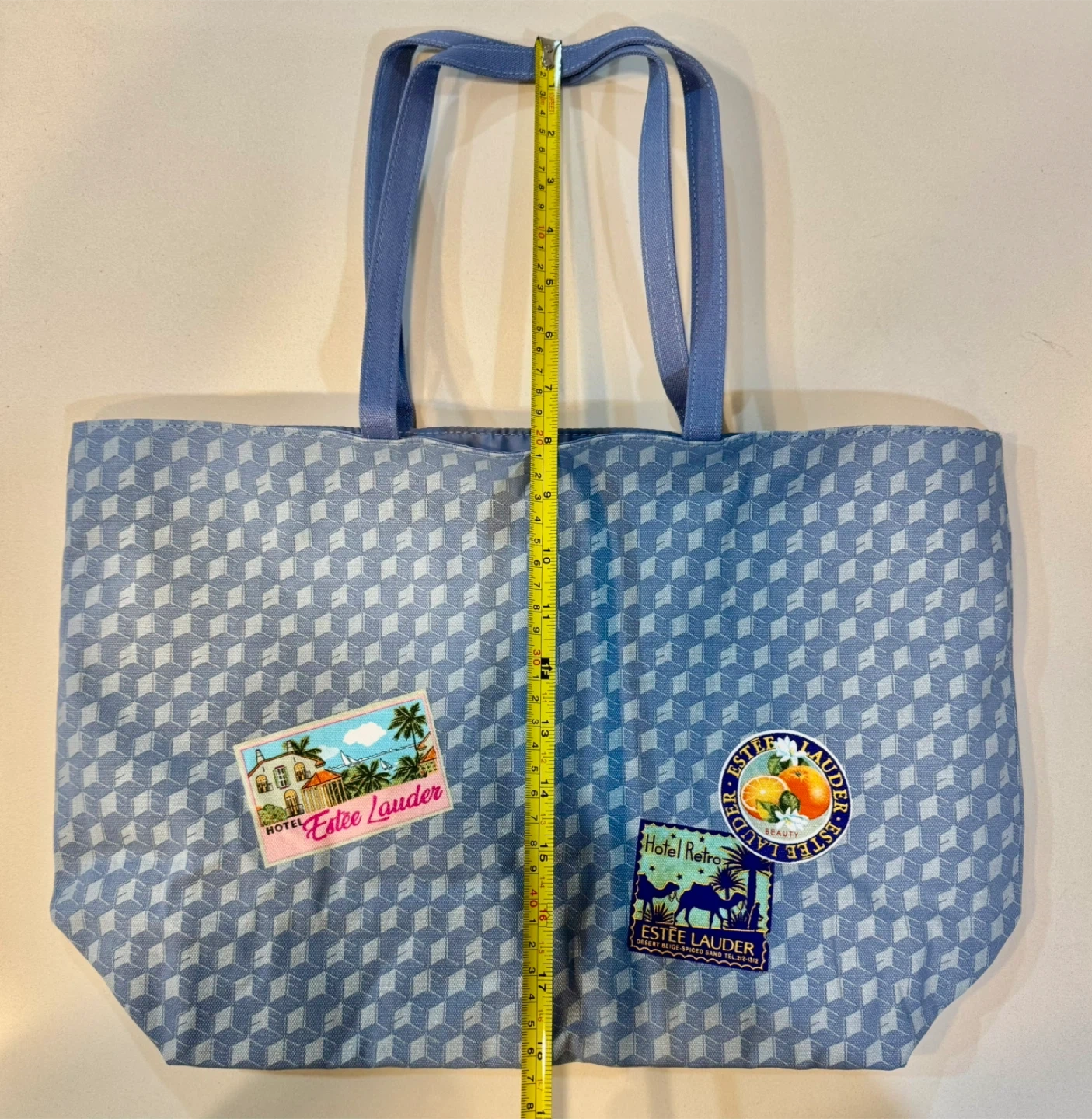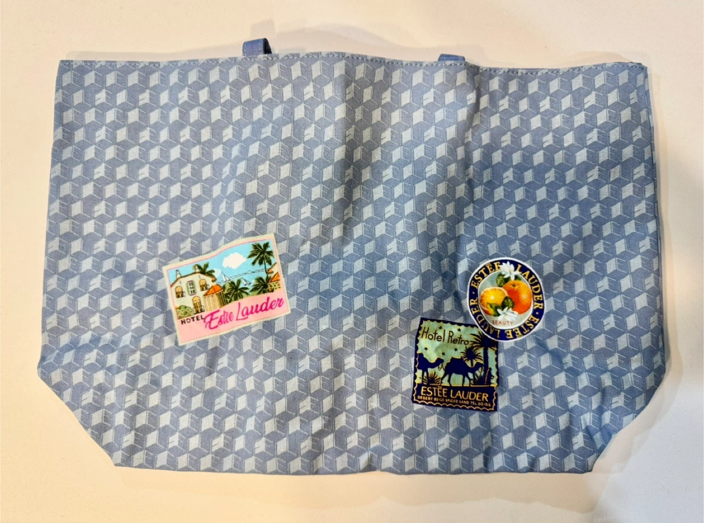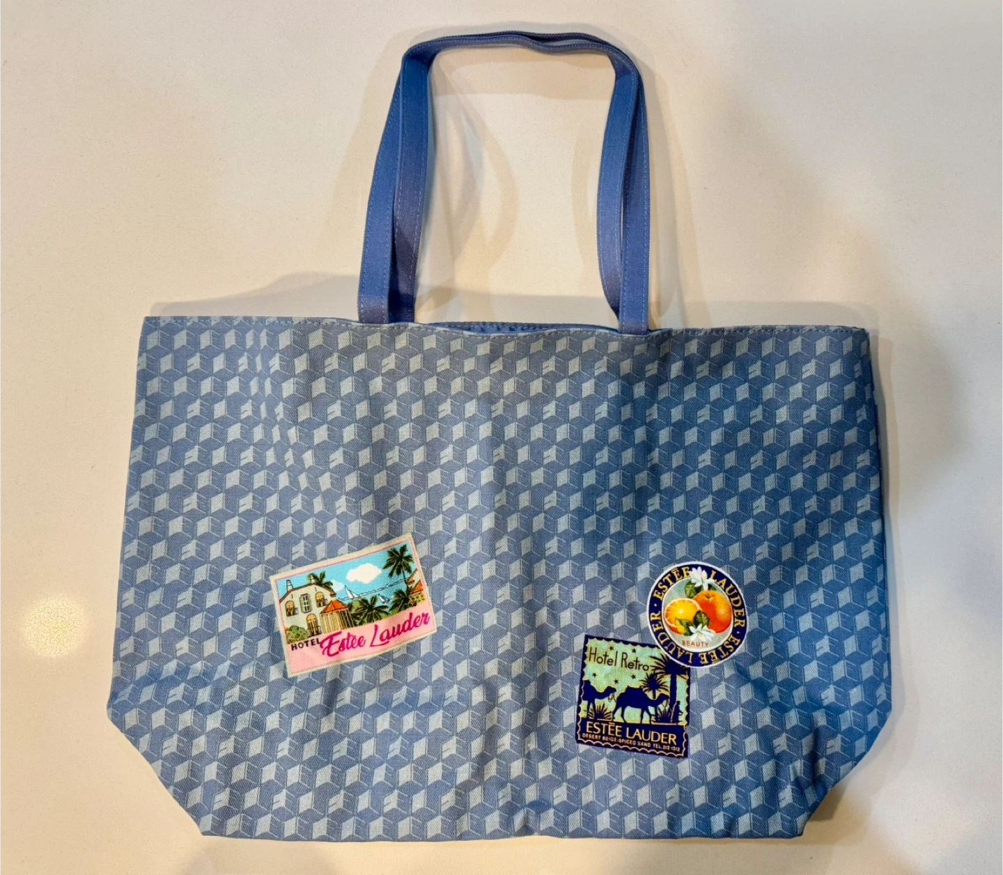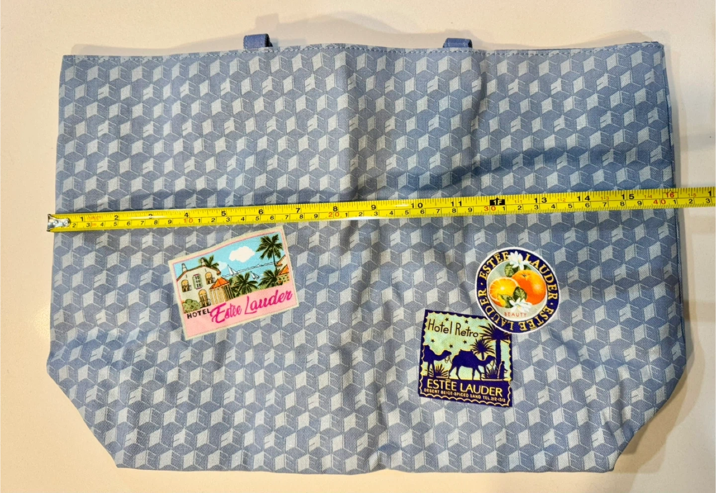 Here's a cute Estee Lauder tote bag! It's blue with a geometric pattern and has some fun patches on it. It's about 16 inches wide.