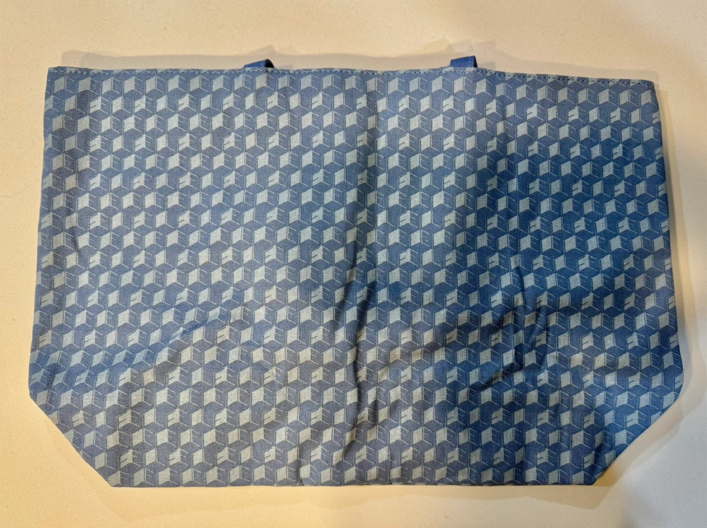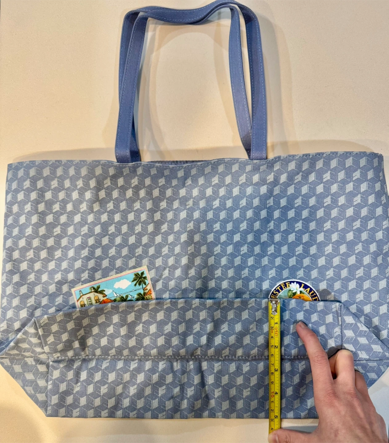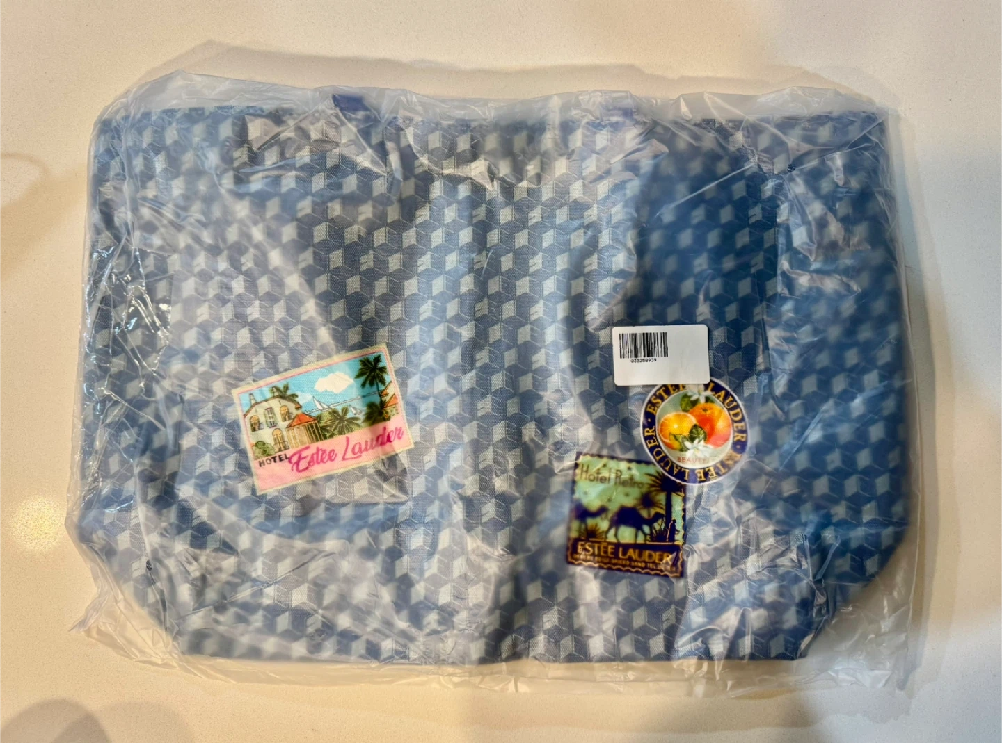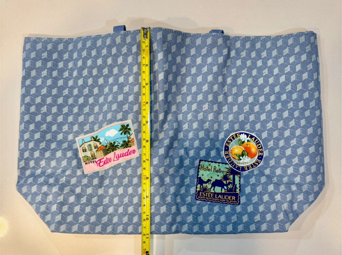 Here's a cute Estee Lauder tote bag! It's blue with a geometric pattern and has some fun patches on it. It's about 16 inches wide.