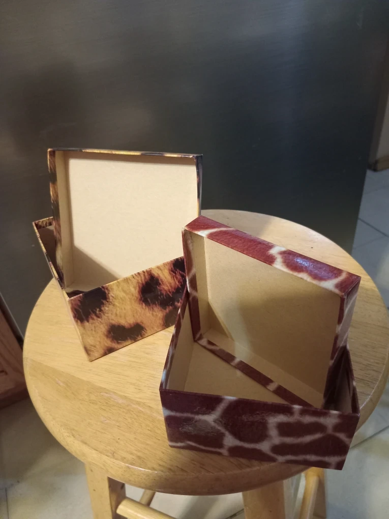 Selling a set of two decorative boxes with animal prints! One has a giraffe print and the other a leopard print. They're perfect for storing small items or as part of your home decor