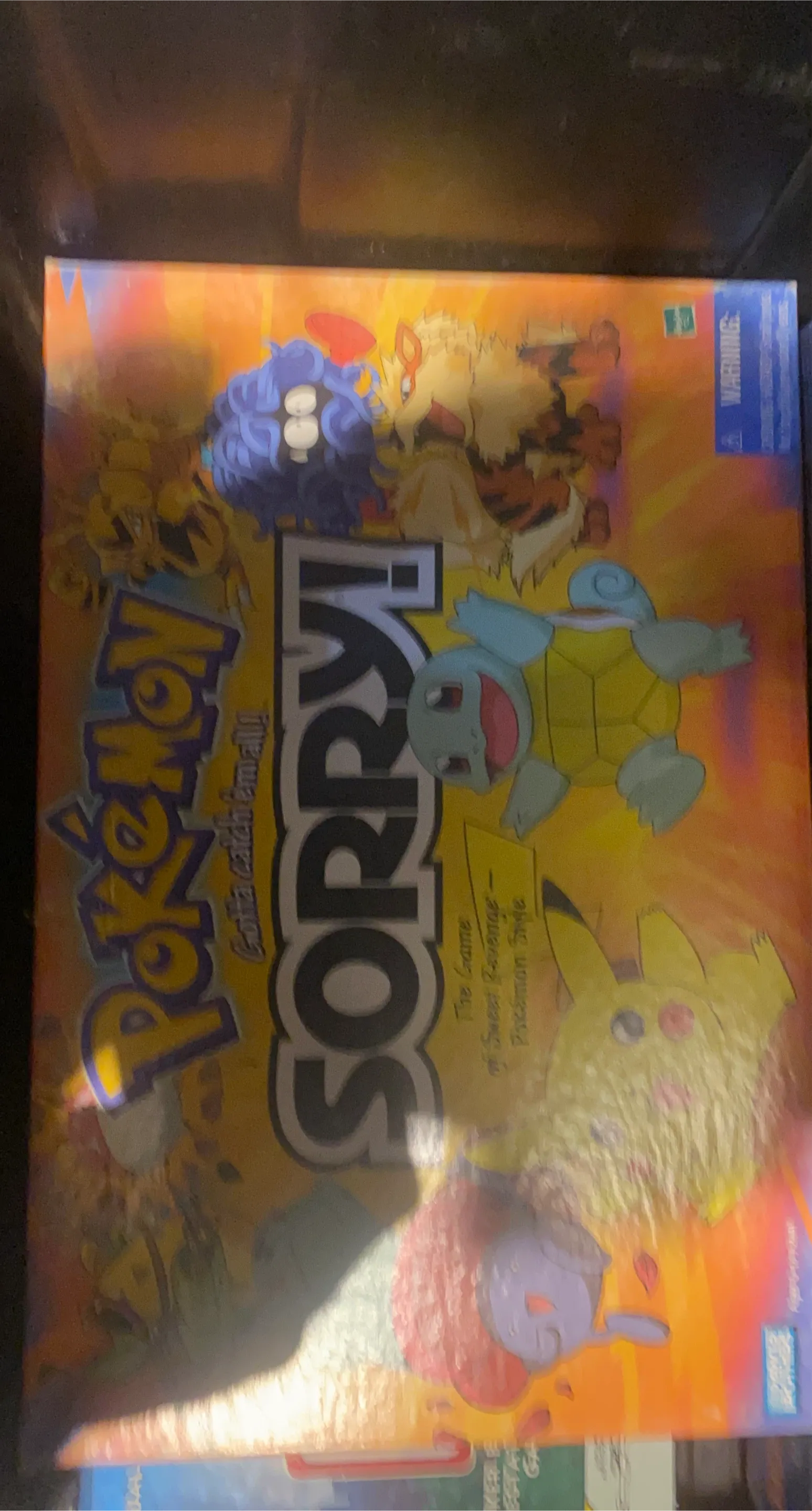 It's the classic Sorry! board game with a fun Pokemon twist! This version is branded with Pokemon characters and includes the tagline 'Gotta catch 'em all!' It's the game of sweet revenge in Pokemon style. The box is included with the game.
