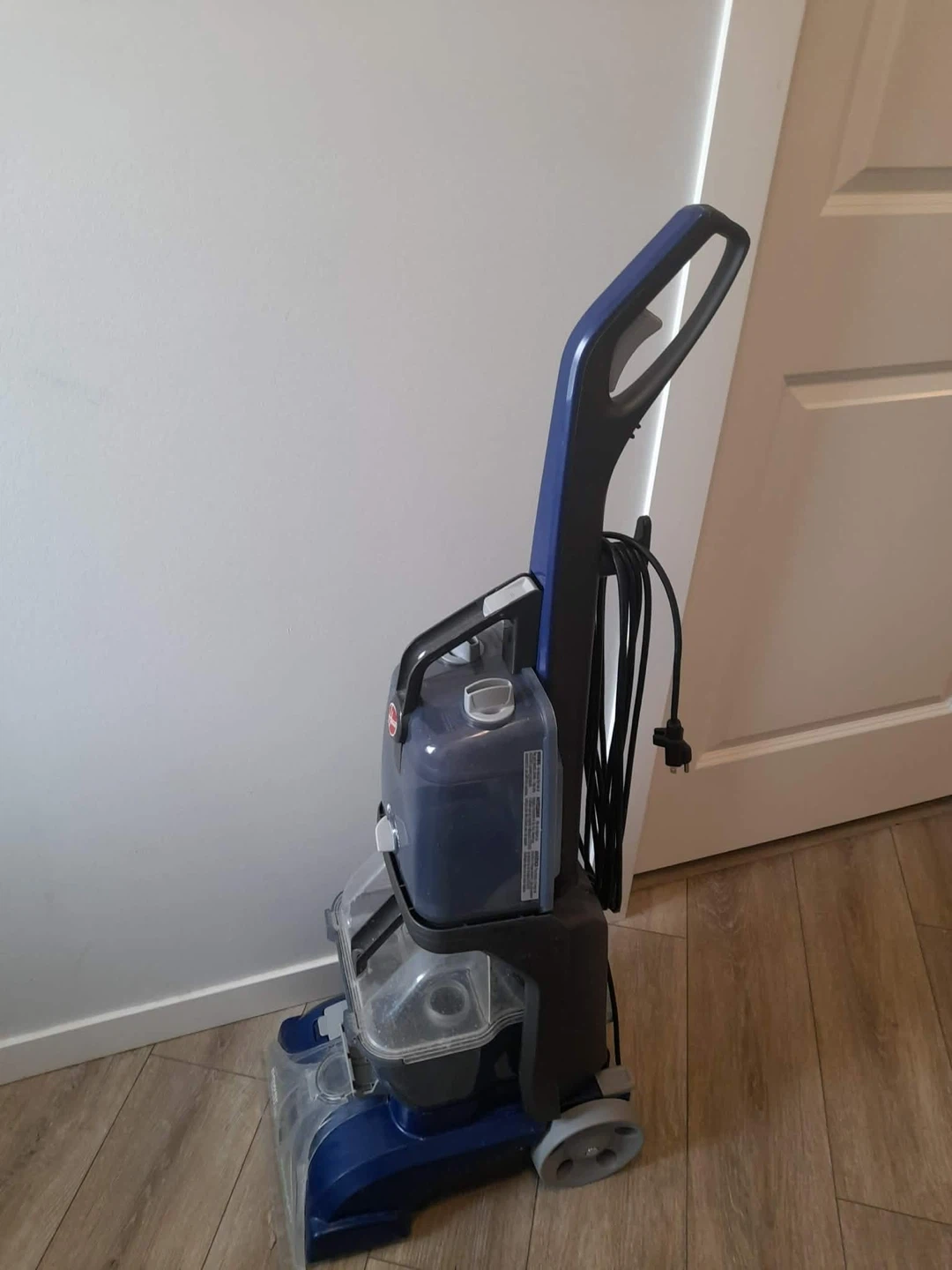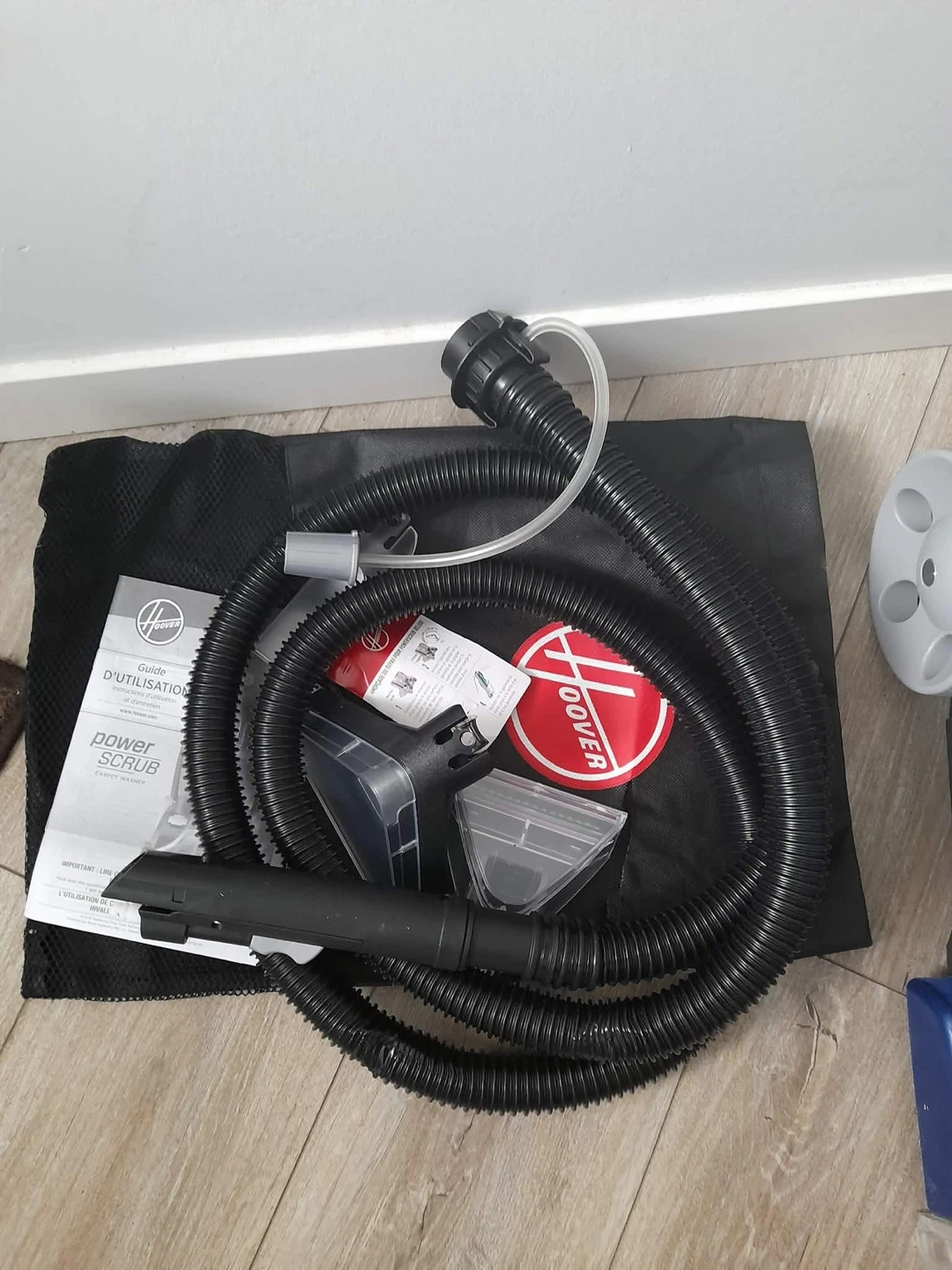 This Hoover Power Scrub Deluxe carpet cleaner is in great working condition. It comes with the hose, nozzle, and a carry bag. It's perfect for tackling tough carpet stains and refreshing your home's carpets!