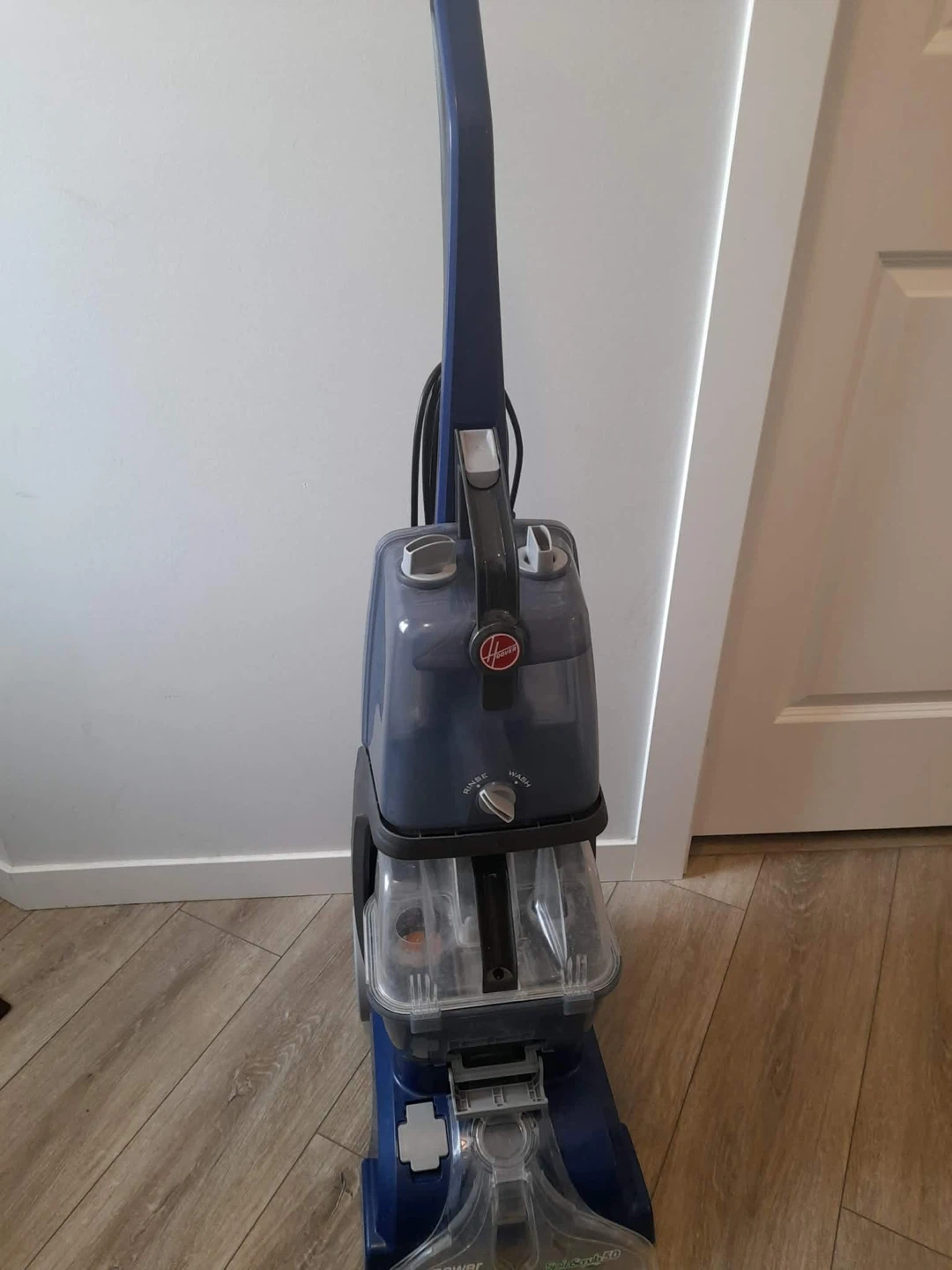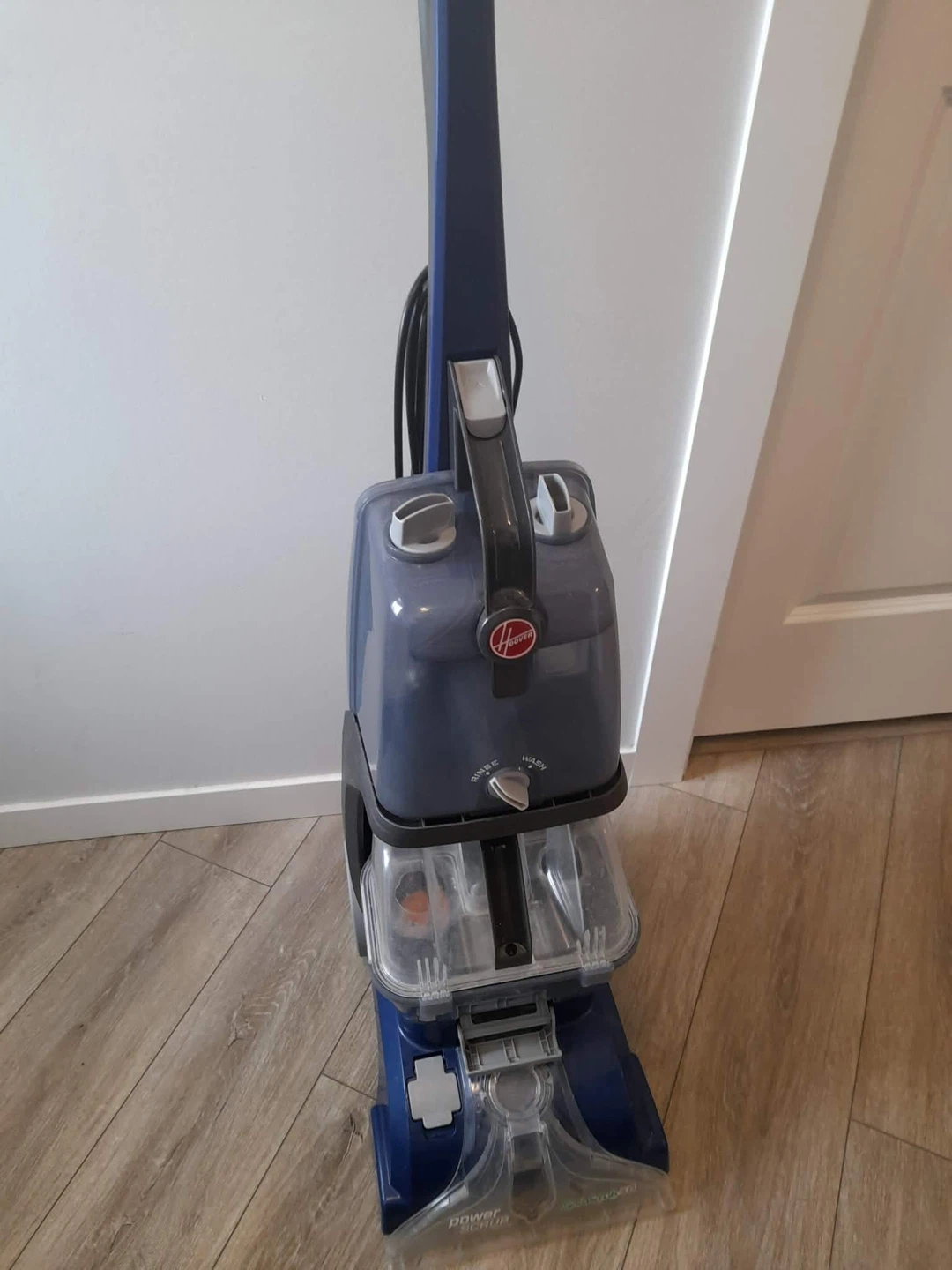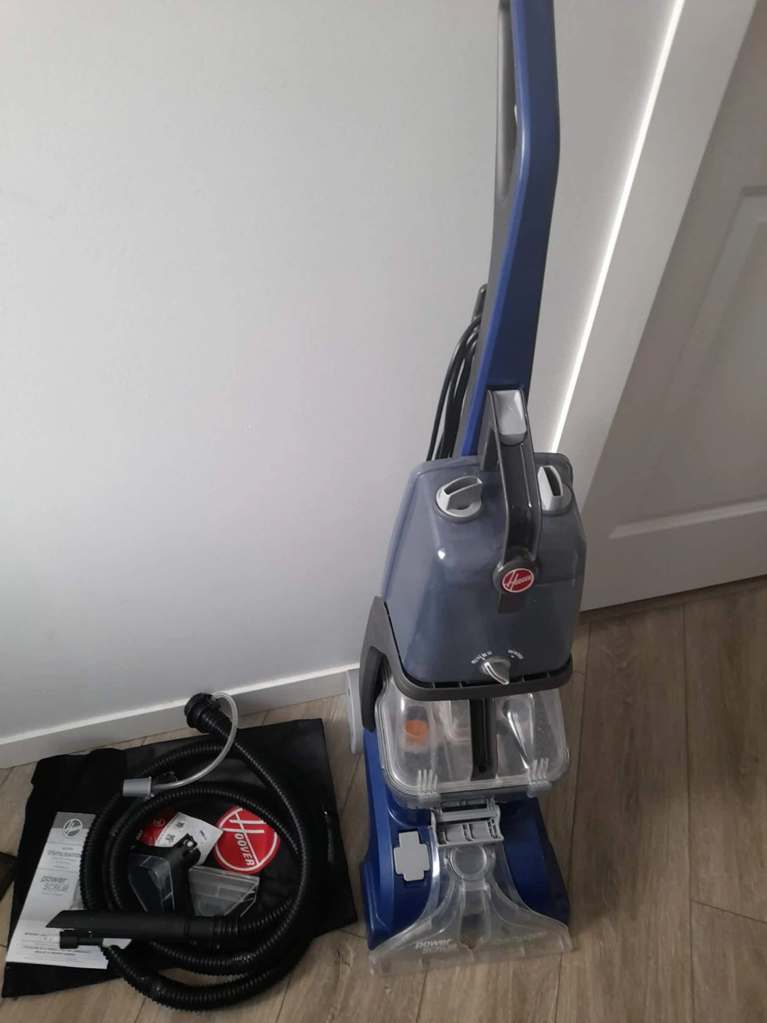 This Hoover Power Scrub Deluxe carpet cleaner is in great working condition. It comes with the hose, nozzle, and a carry bag. It's perfect for tackling tough carpet stains and refreshing your home's carpets!