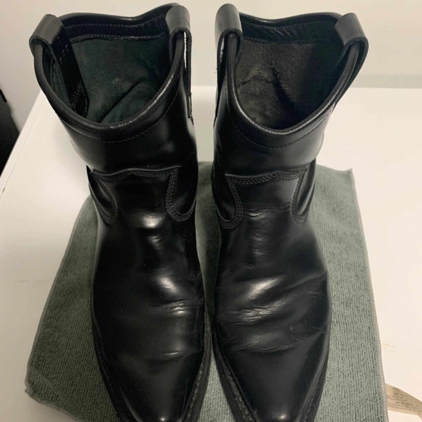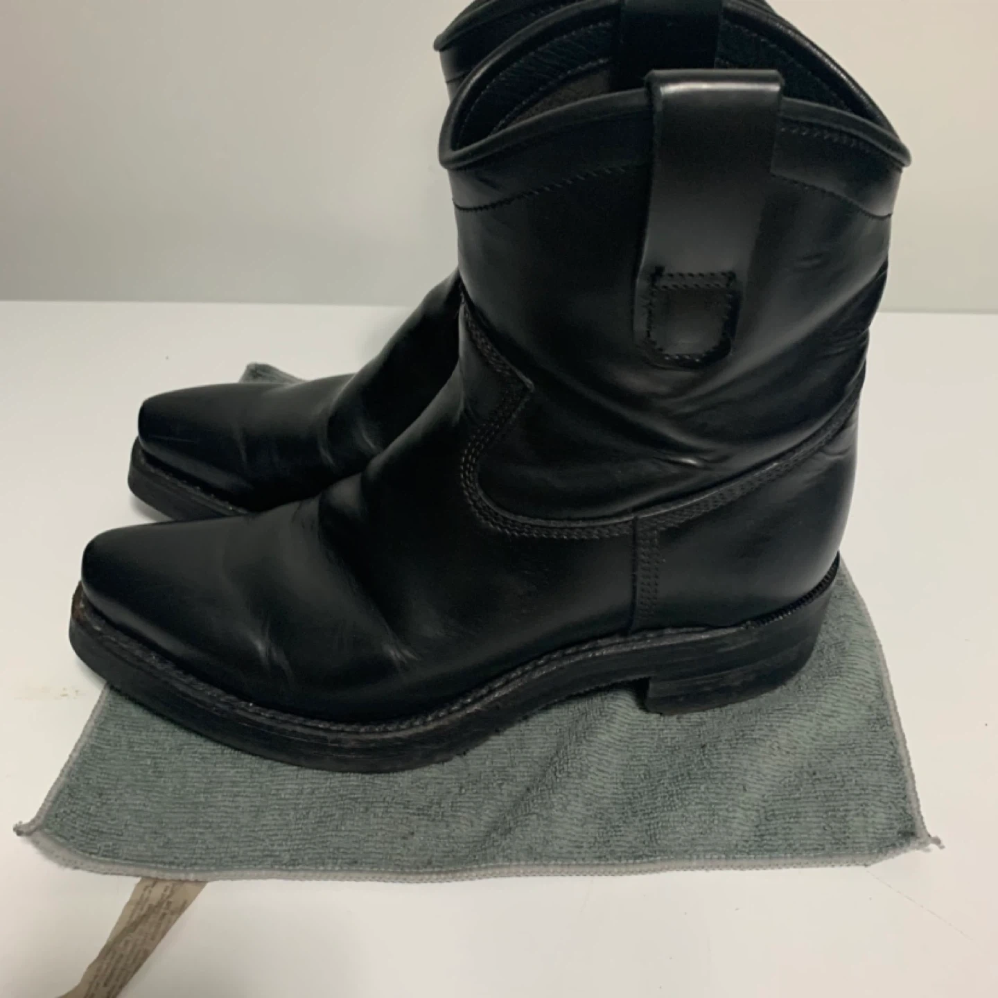 Classic black leather cowboy boots with a pointed toe and stacked heel. Leather lining and sole. These boots are ready for wear!