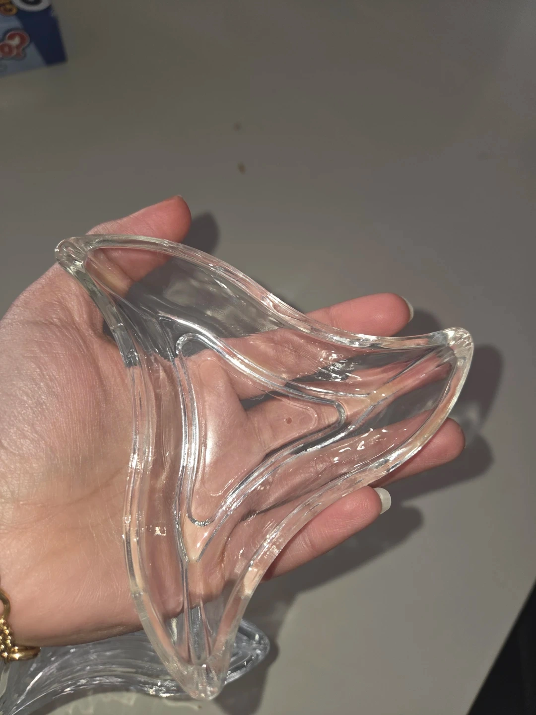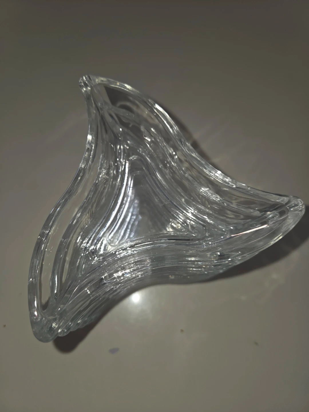 This is a set of 6 clear glass pinch bowls. They have a unique wavy, triangular shape. Perfect for serving small snacks, dips, or condiments.