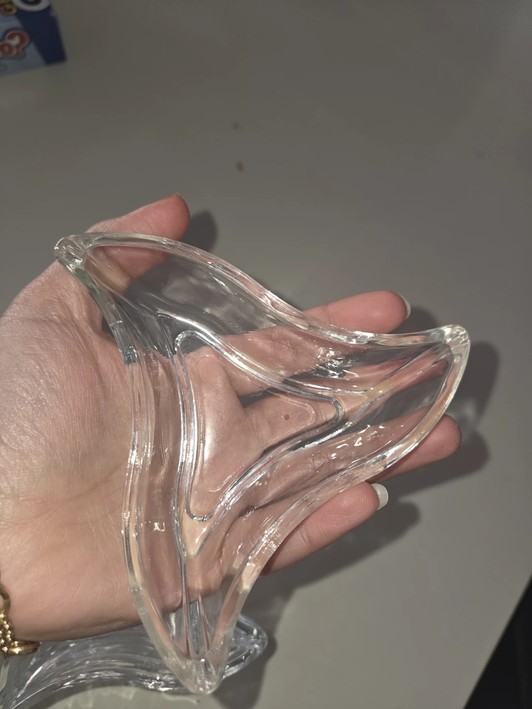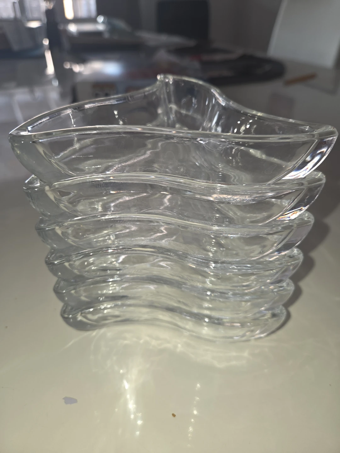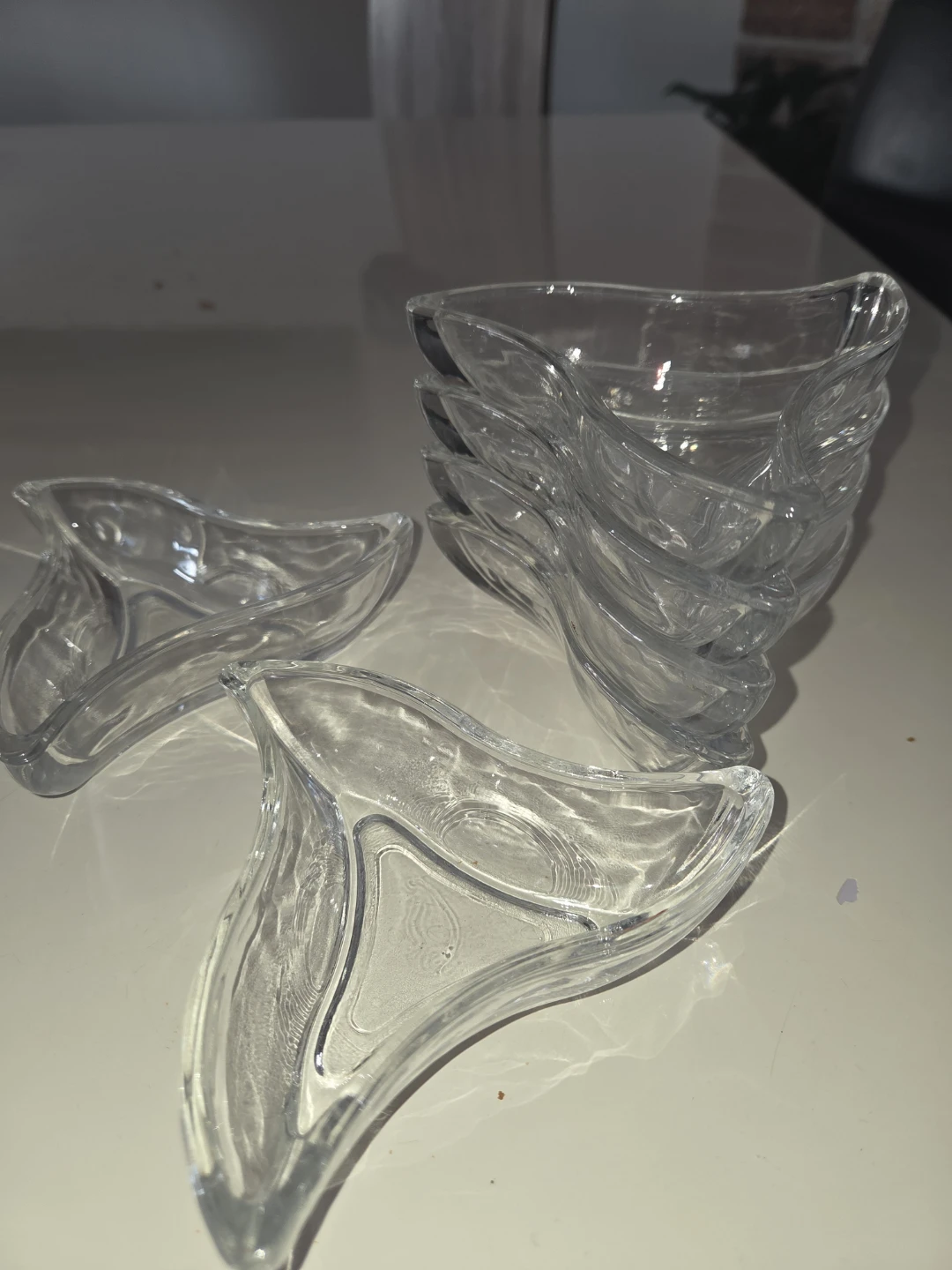 This is a set of 6 clear glass pinch bowls. They have a unique wavy, triangular shape. Perfect for serving small snacks, dips, or condiments.
