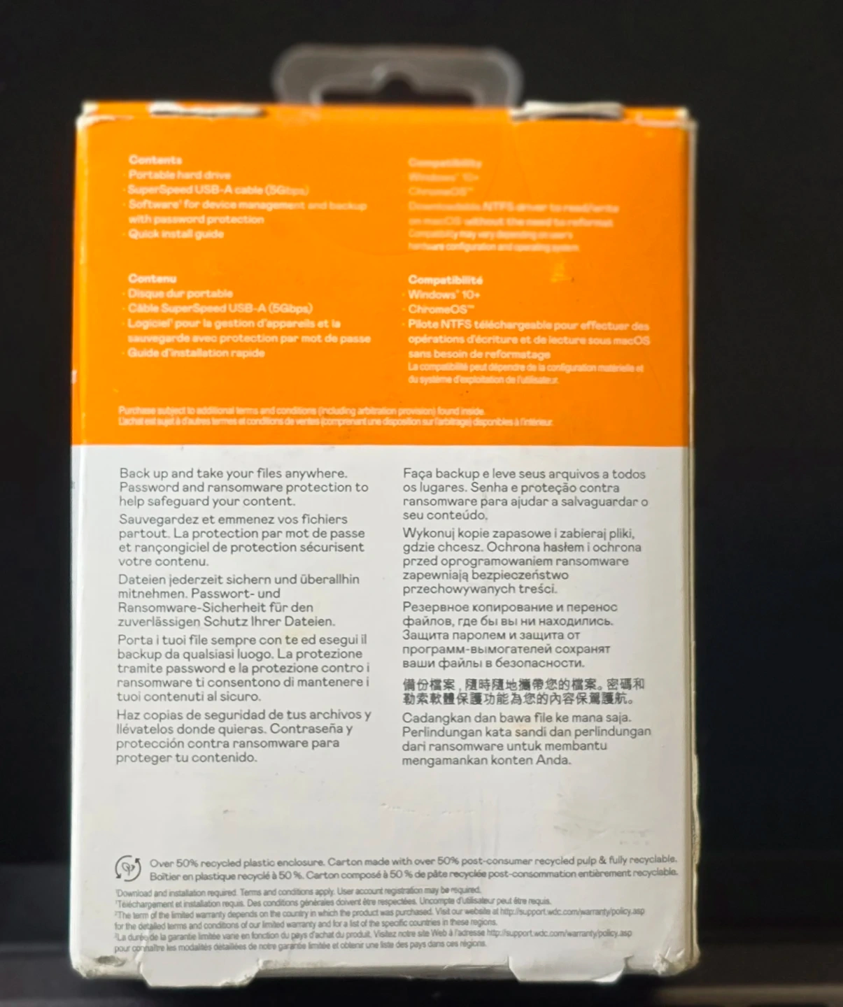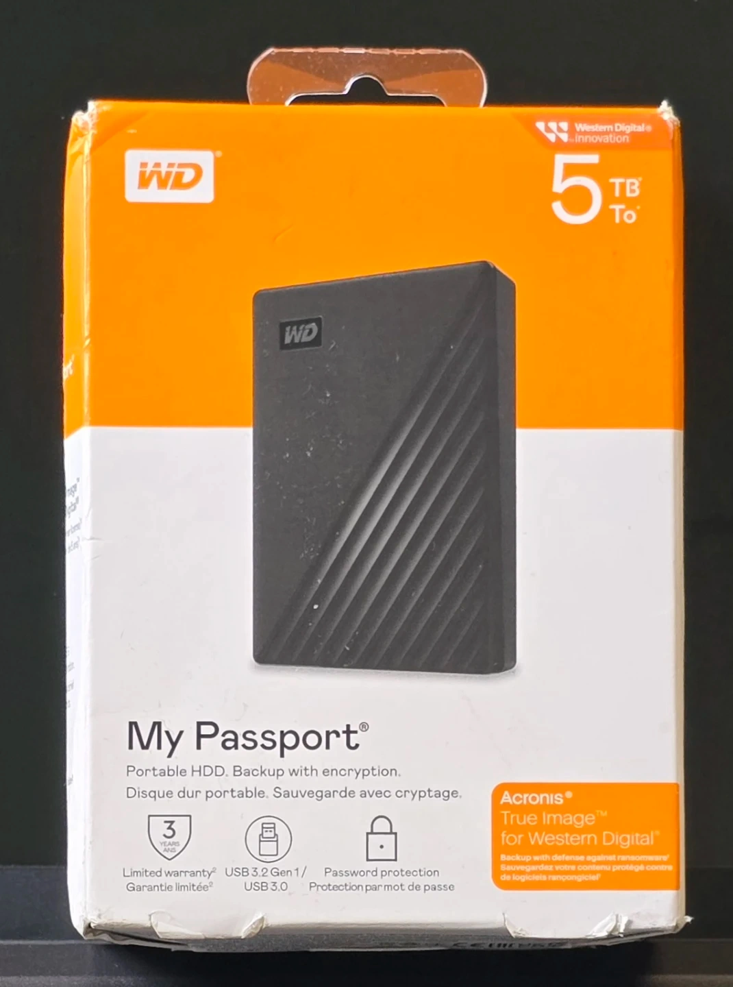 WD My Passport portable hard drive with 5TB capacity. It's great for backing up your data. Features USB 3.2 Gen 1/USB 3.0 compatibility.