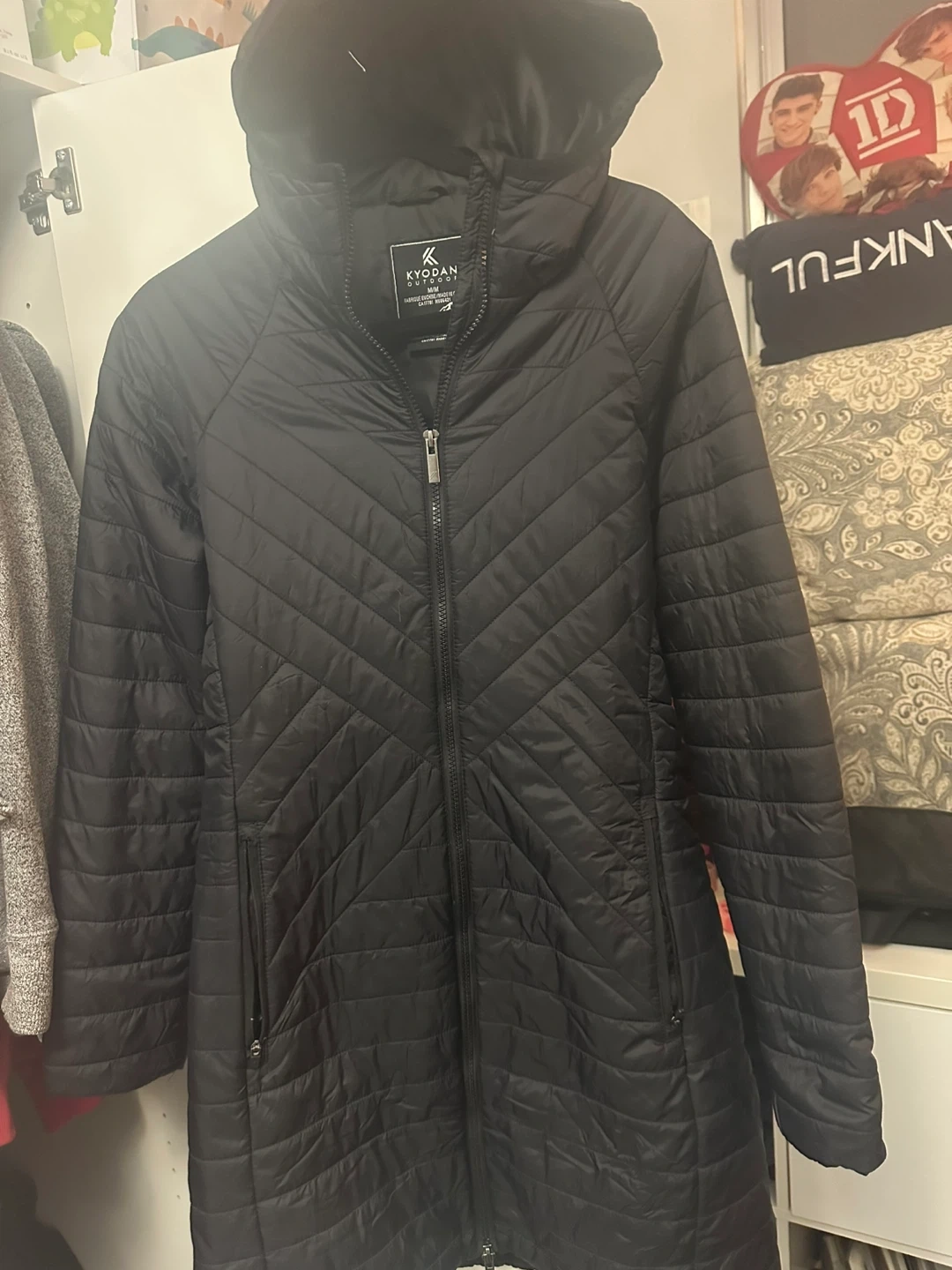 Kyodan Outdoor quilted puffer jacket. It's a women's size medium in black. Features a full zip front and hood.