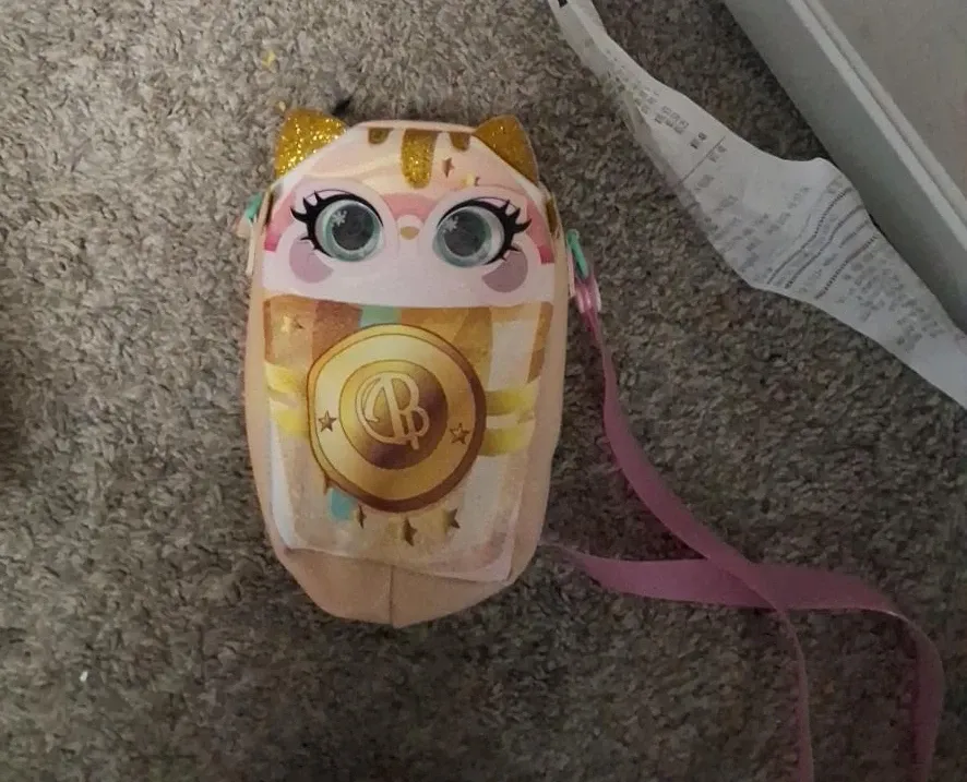 It's a cute plush coin purse shaped like a cat. It has glittery gold ears and a pink strap. A gold coin emblem with a 'B' is on the front.