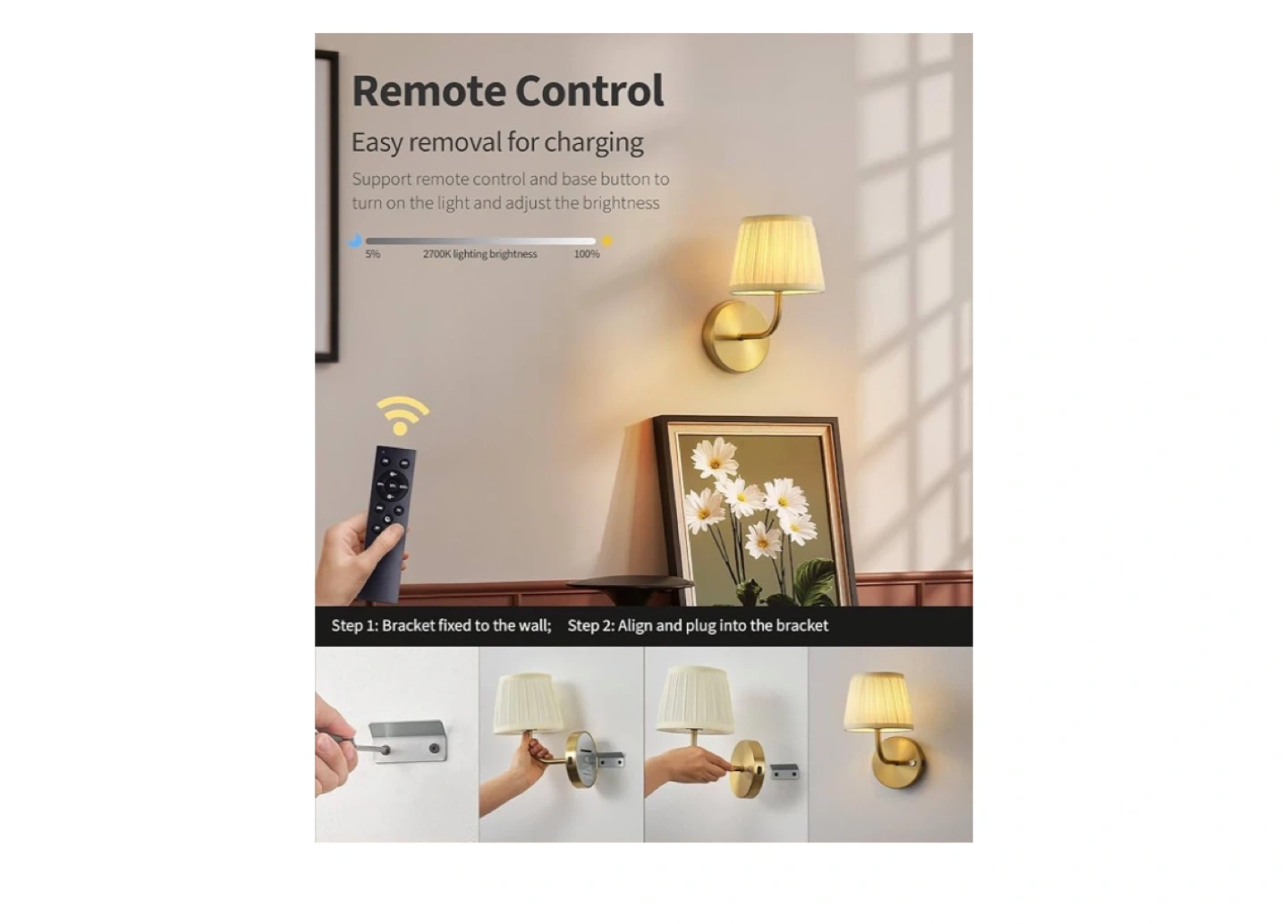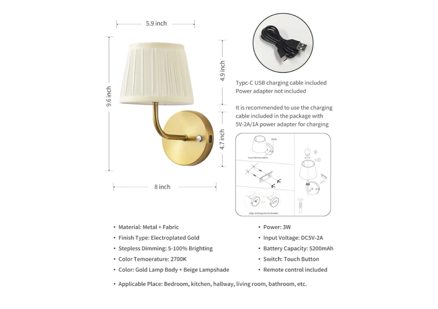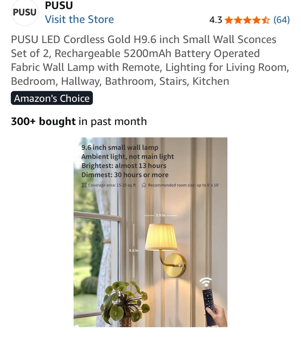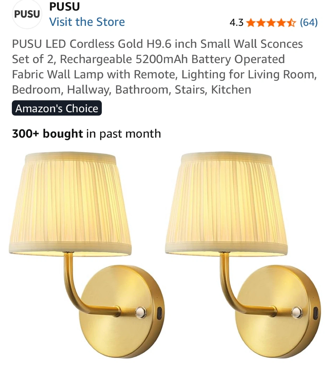 PUSU LED Cordless Gold H9.6 inch Small Wall Sconces Set of 2, Rechargeable 5200mAh Battery Operated Fabric Wall Lamp with Remote, Lighting for Living Room, Bedroom, Hallway, Bathroom, Stairs, Kitchen.