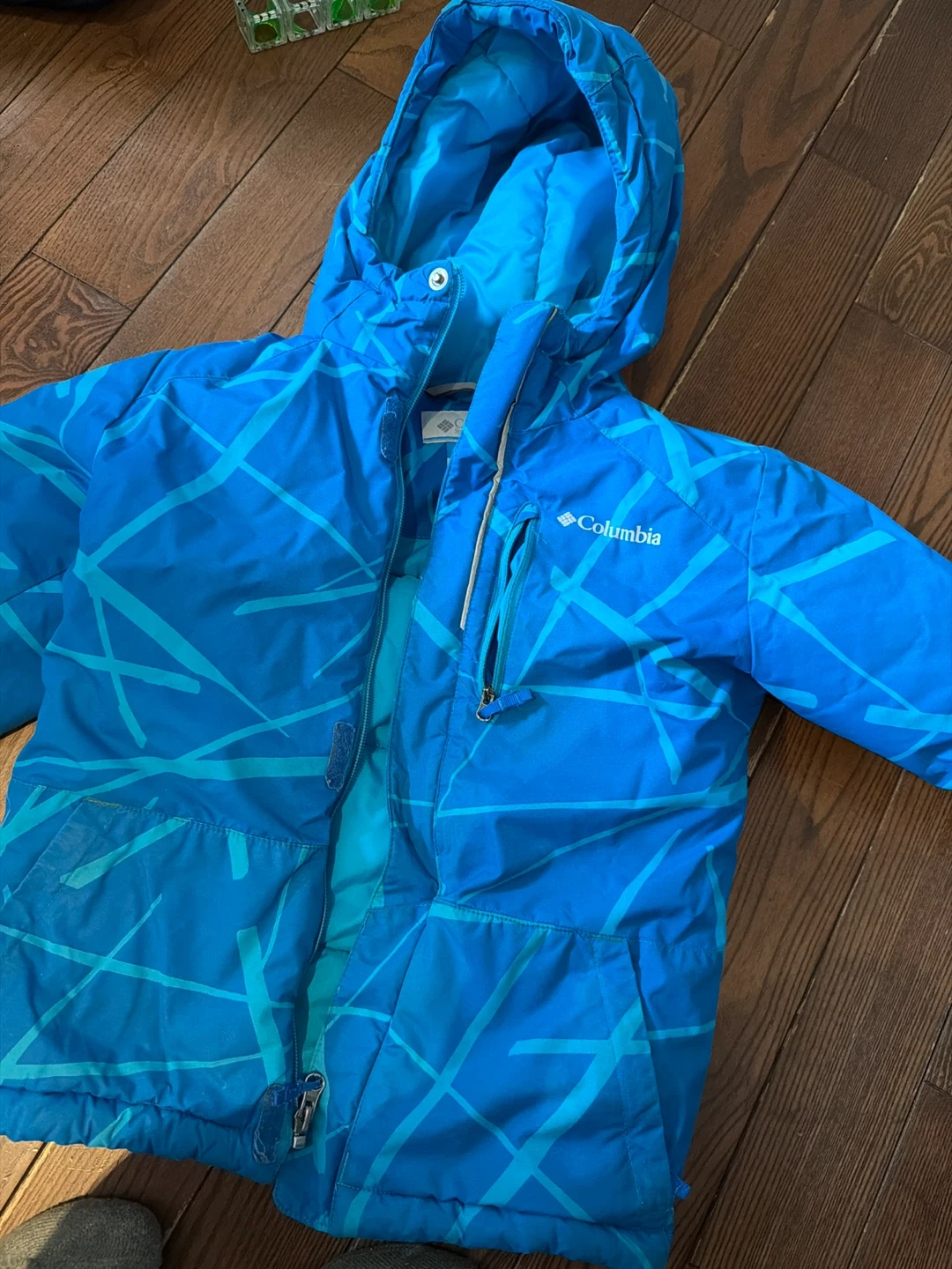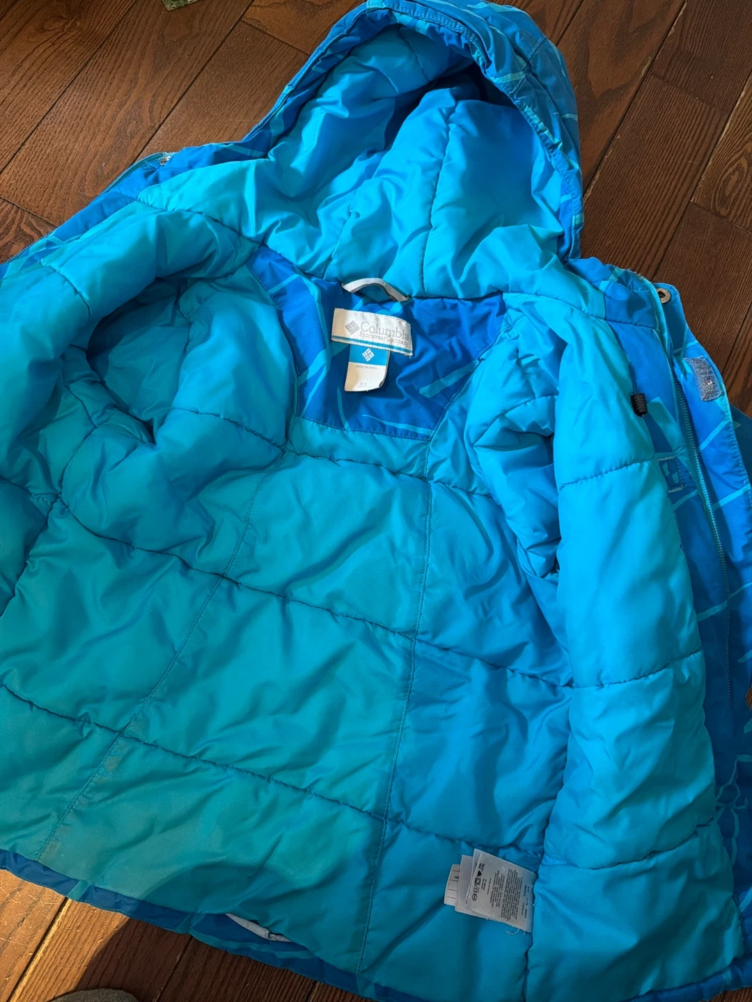 Columbia boys' blue winter jacket with a cool abstract pattern.