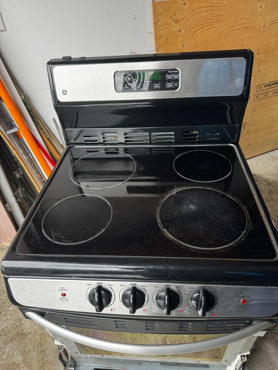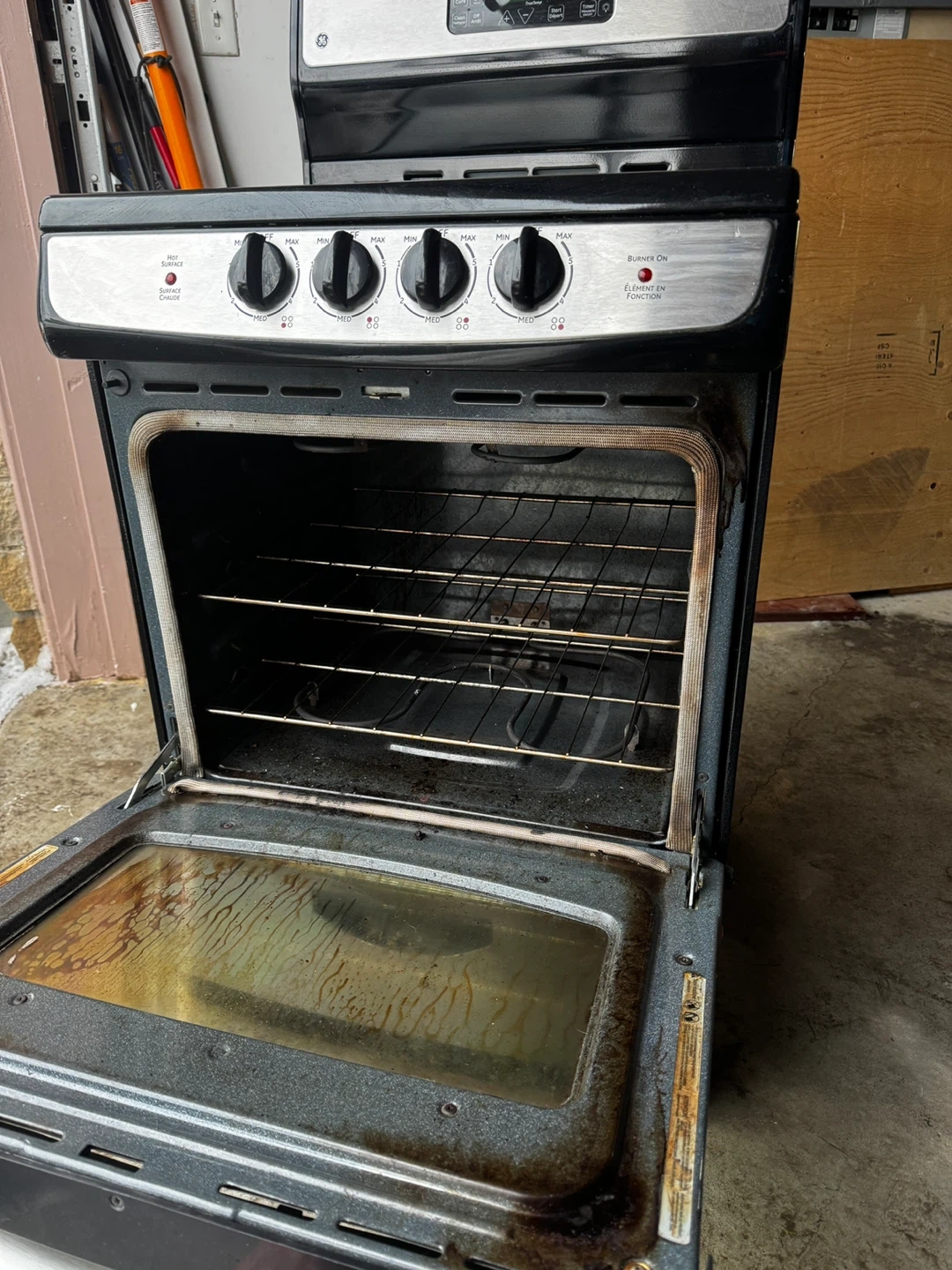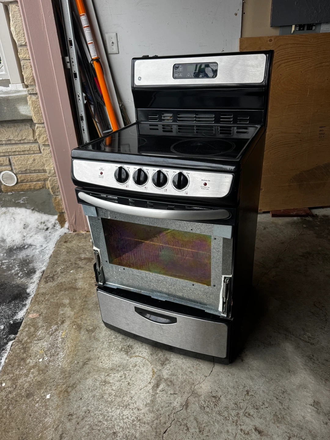 This is a GE electric stove. It features four burners on top. The oven includes multiple racks. Everything is functional, just missing the front glass which is not produced anymore and cannot be replaced. Selling for parts.