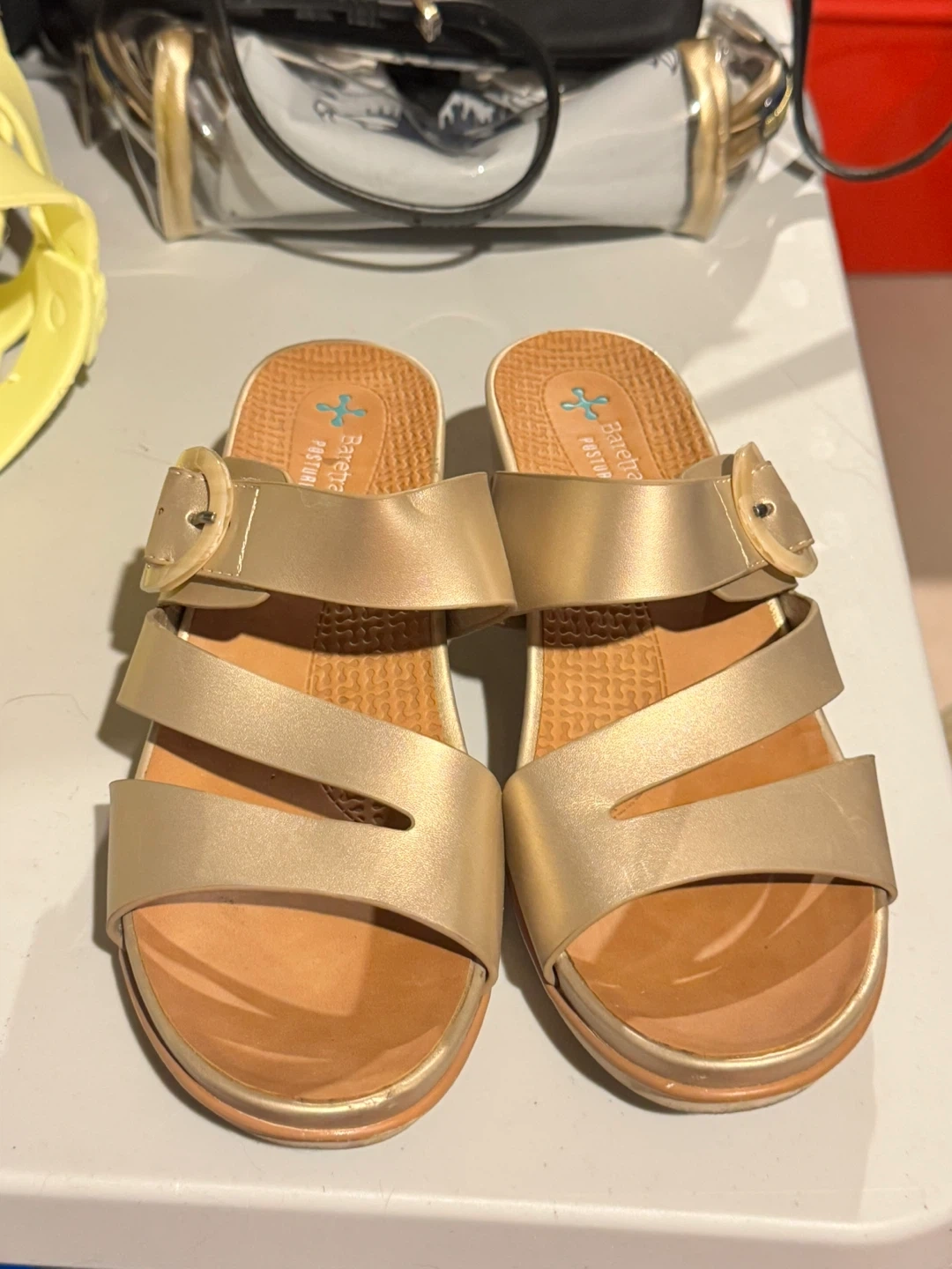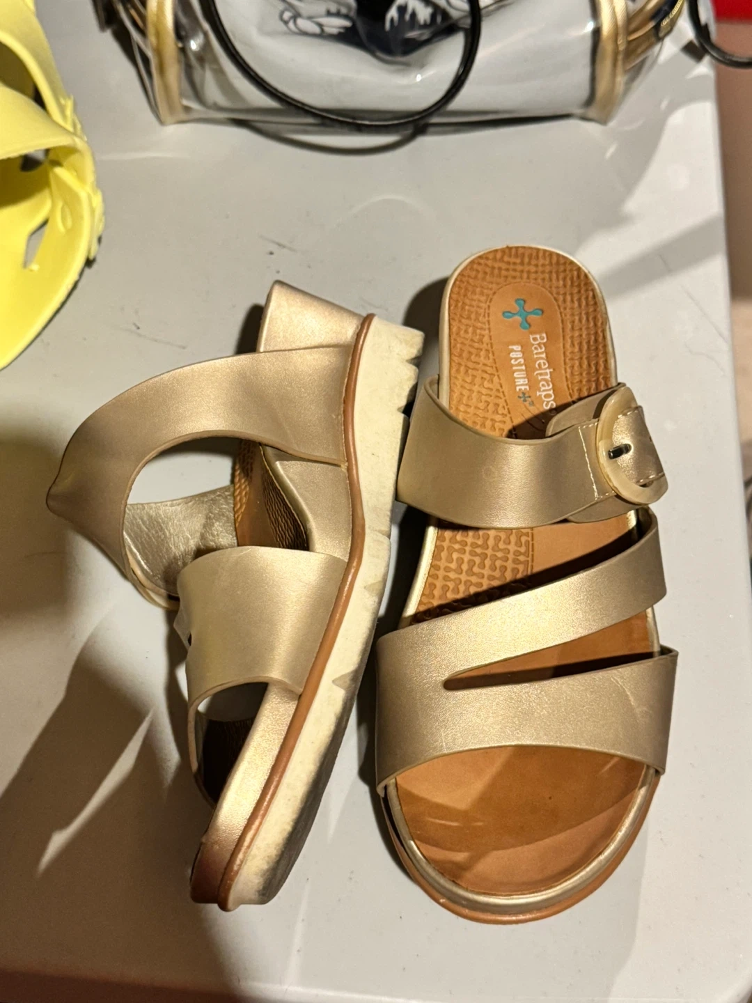 Comfortable gold strappy wedge sandals from Baretraps. Open-toe style with adjustable buckle and decorative straps across the foot. Offers a nice lift with a comfortable sole. Good for casual wear or dressing up an outfit!