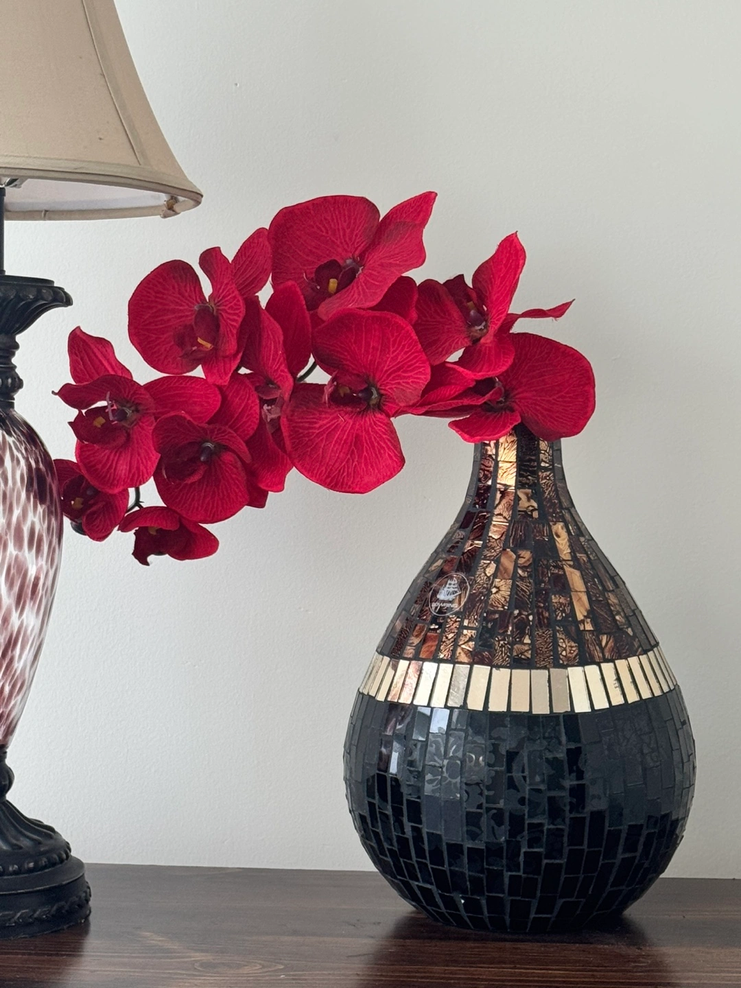 This is a decorative mosaic vase. It features a black mosaic base with a band of gold and brown mosaic tiles near the top. Comes with artificial red orchid flowers. It's a beautiful accent piece for any room!