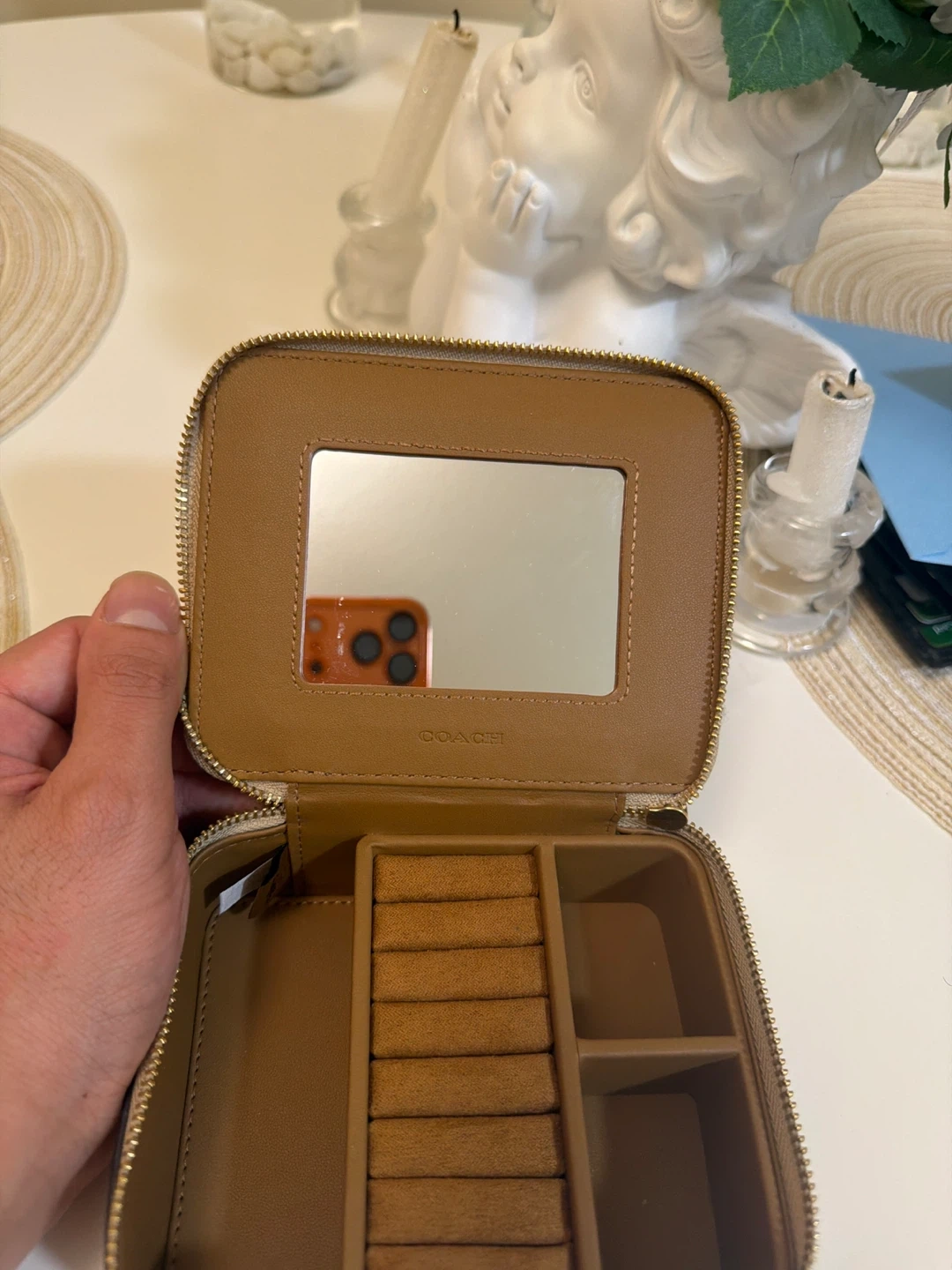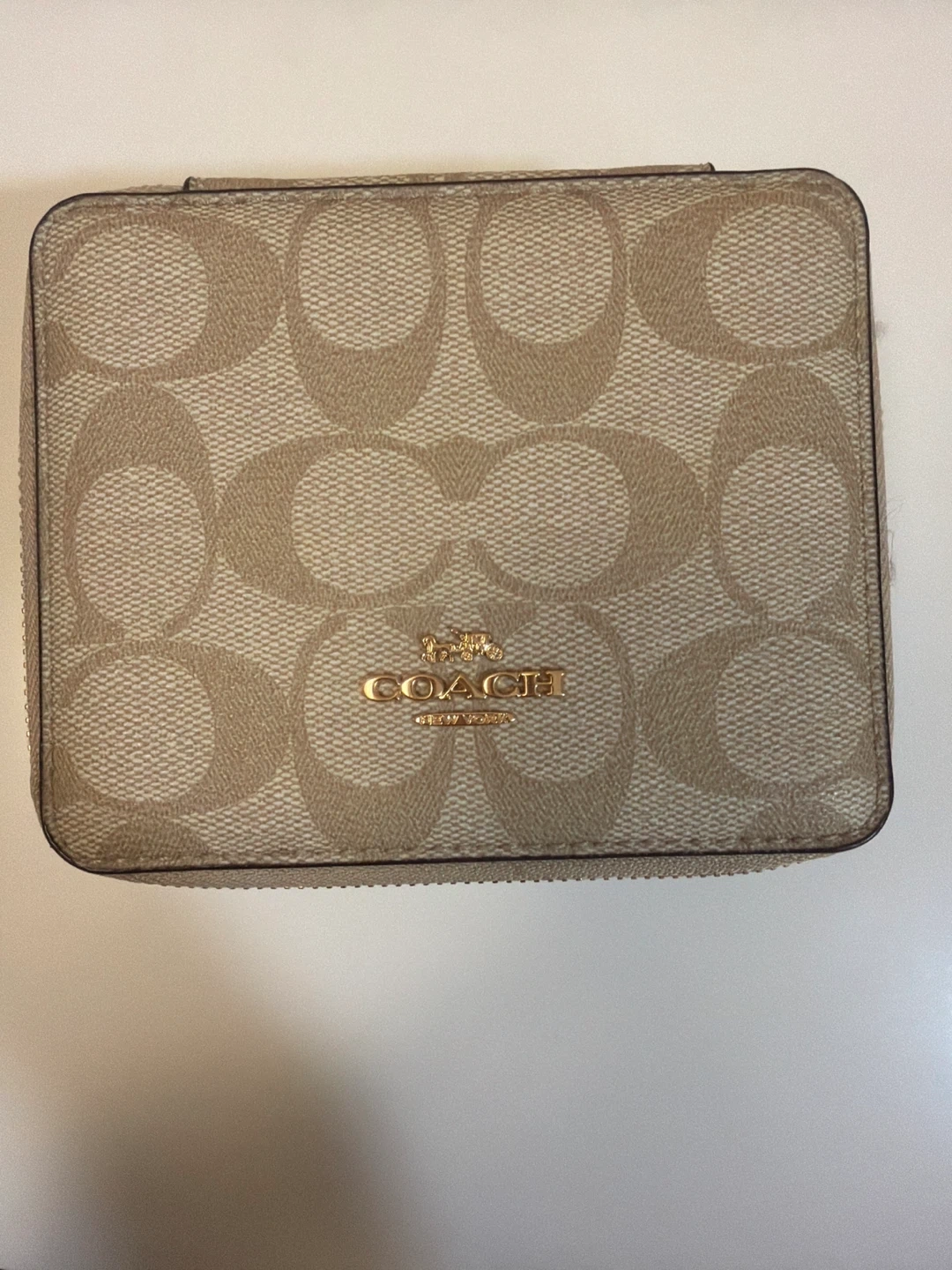 Easy great gift for your GF,wife …. This Coach jewelry box is perfect for travel. It features a signature C pattern with gold hardware. Inside, it has ring rolls and compartments for your accessories. It also includes a small mirror!
