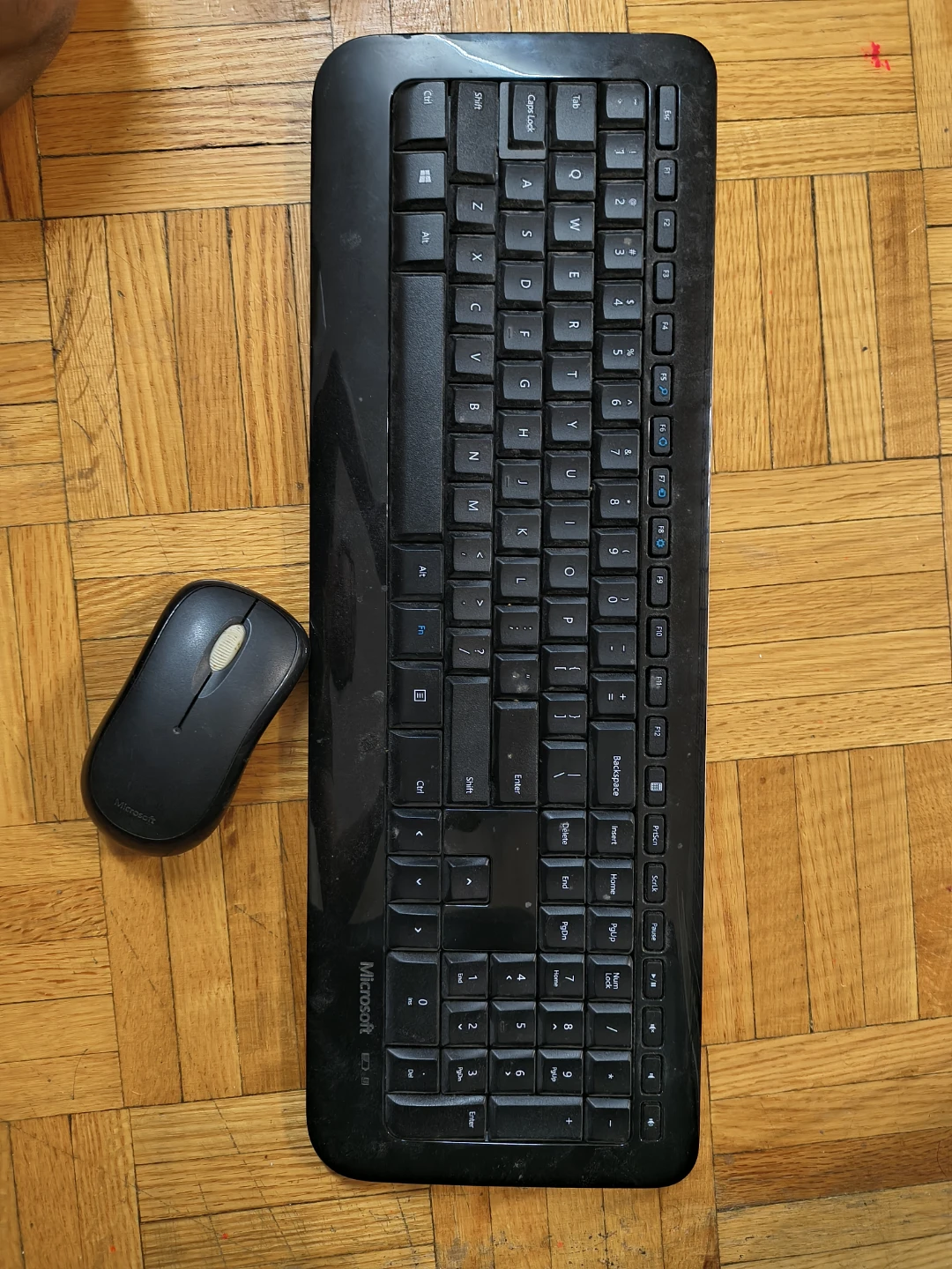 This is a Microsoft wireless keyboard and mouse set. It's a black, full-size keyboard with a numeric keypad and a compact wireless mouse. The set connects wirelessly for a clutter-free desk.