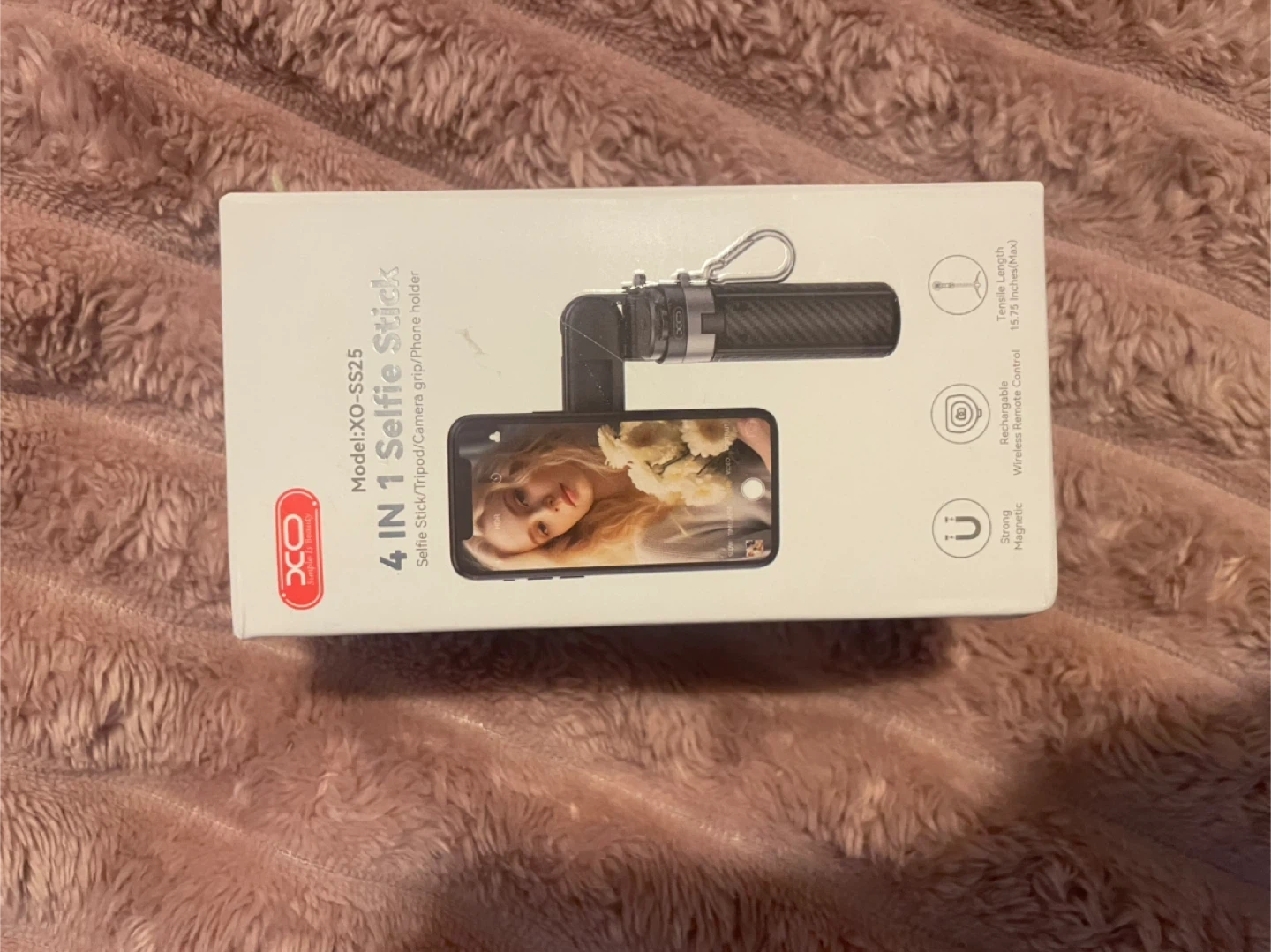 I'm selling a brand new XO-SS25 4 in 1 Selfie Stick! It's a selfie stick, tripod, and camera grip/phone holder all in one. It features a rechargeable wireless remote control and a strong magnetic hold. The tensile length is 15.75 inches.