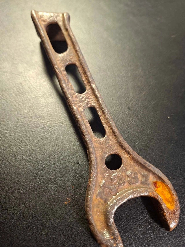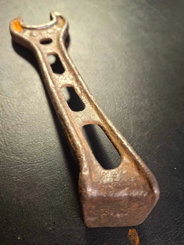 Here's a vintage wrench, showing its age with a charming patina of rust. It measures approximately 15cm in length and is ready to tackle your small renovation project! Given it's a bit rough around the edges, I'm letting it go for a song. Imagine the stories it could tell! If the ad is up, the wrench is available, so no need to ask. Grab it before it rusts away! Cash accepted.