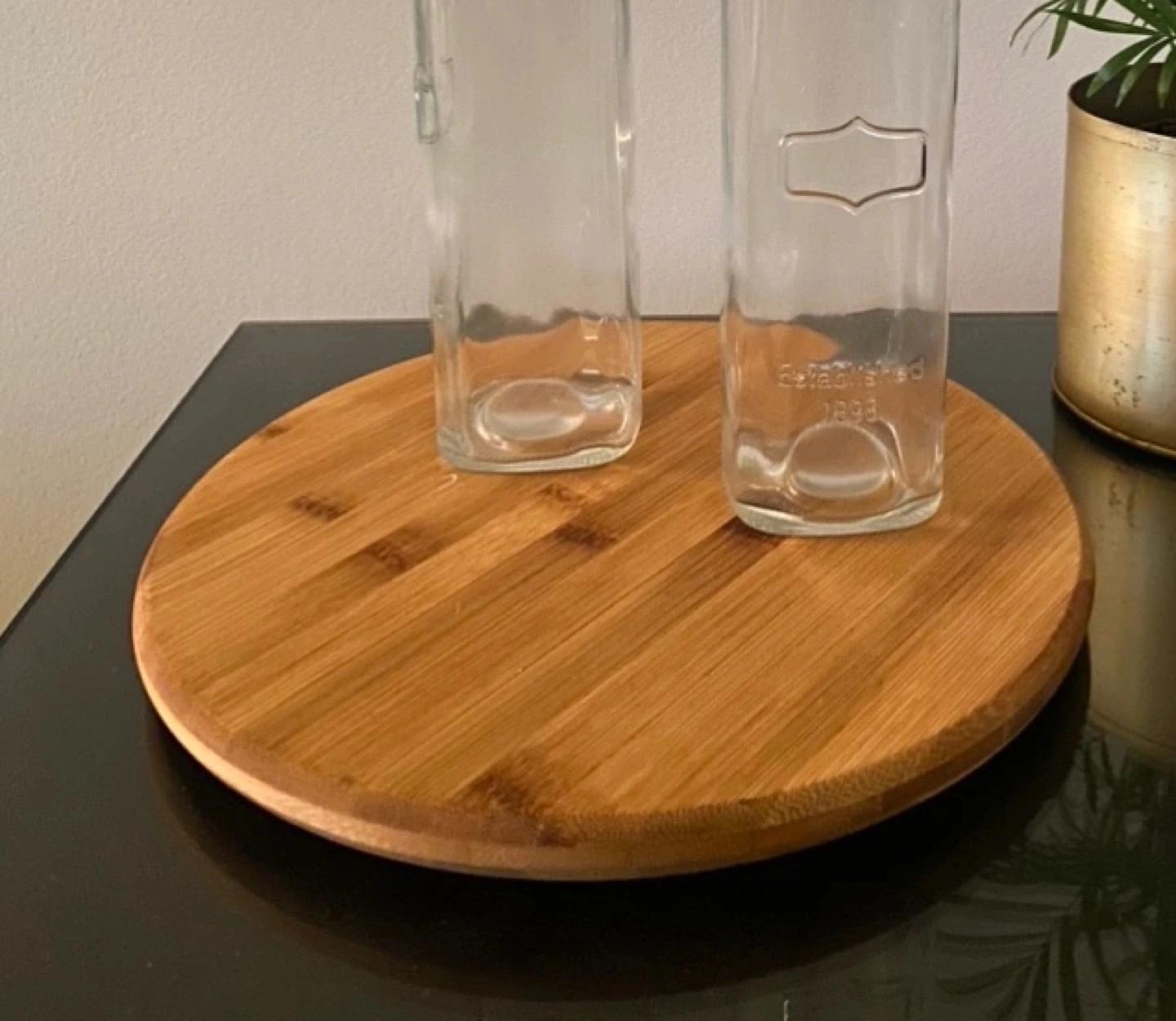Round wooden serving tray. Rotates smoothly 10 inches diameter Used for easy access to oil, salt, pepper on the kitchen platform Pick up in Liberty Village