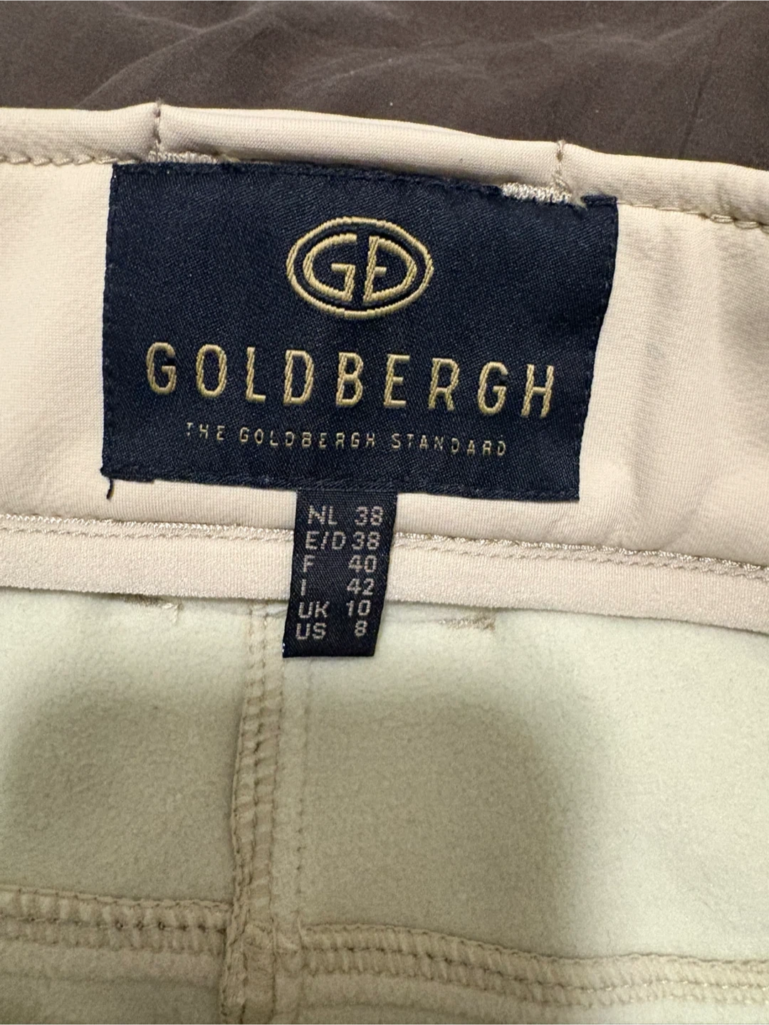 Luxury Europe brand GOLDBERGH stirrup pants in a light beige colour. Features include a branded elastic waistband with a clasp closure and zippered pockets. Made with a durable, stretchy material.