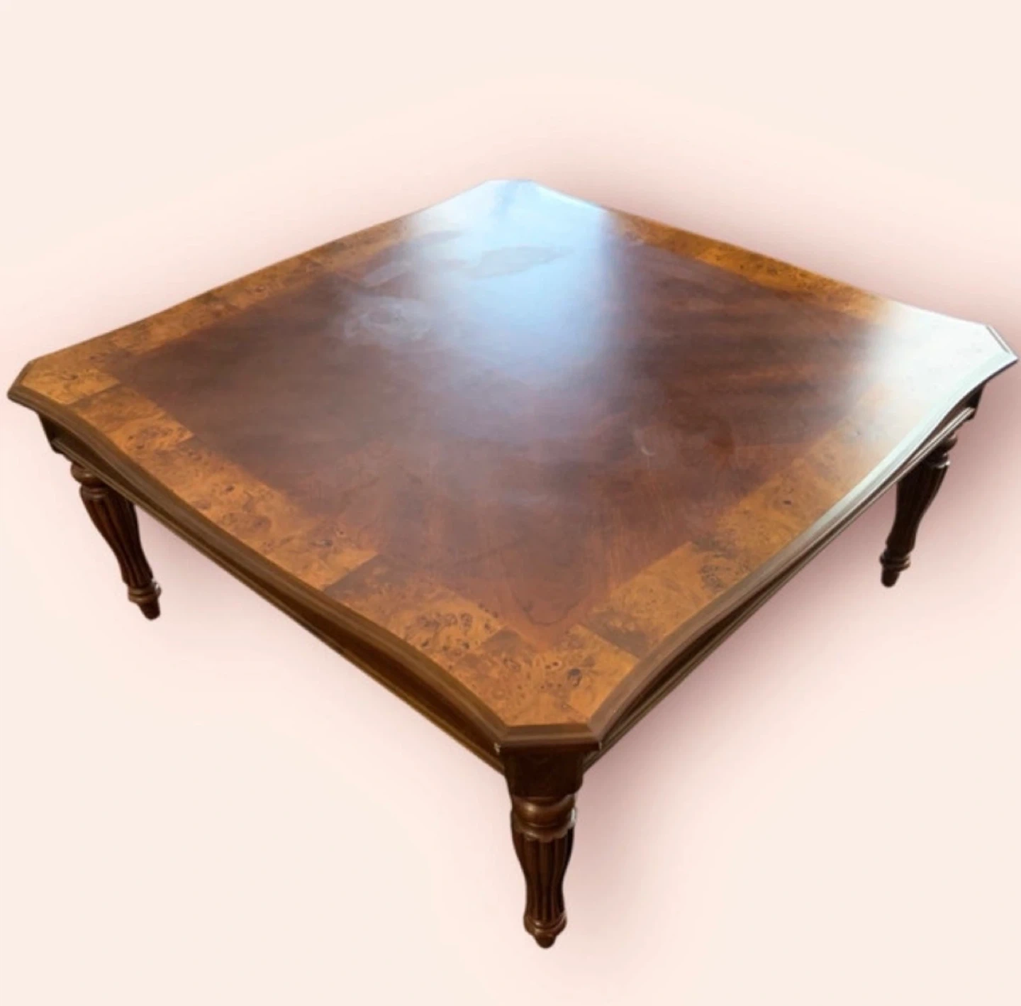 This is a square wood coffee table with detailed inlay. It features carved wooden legs and a durable finish. The table's generous surface area makes it suitable for living rooms. 40x40x18