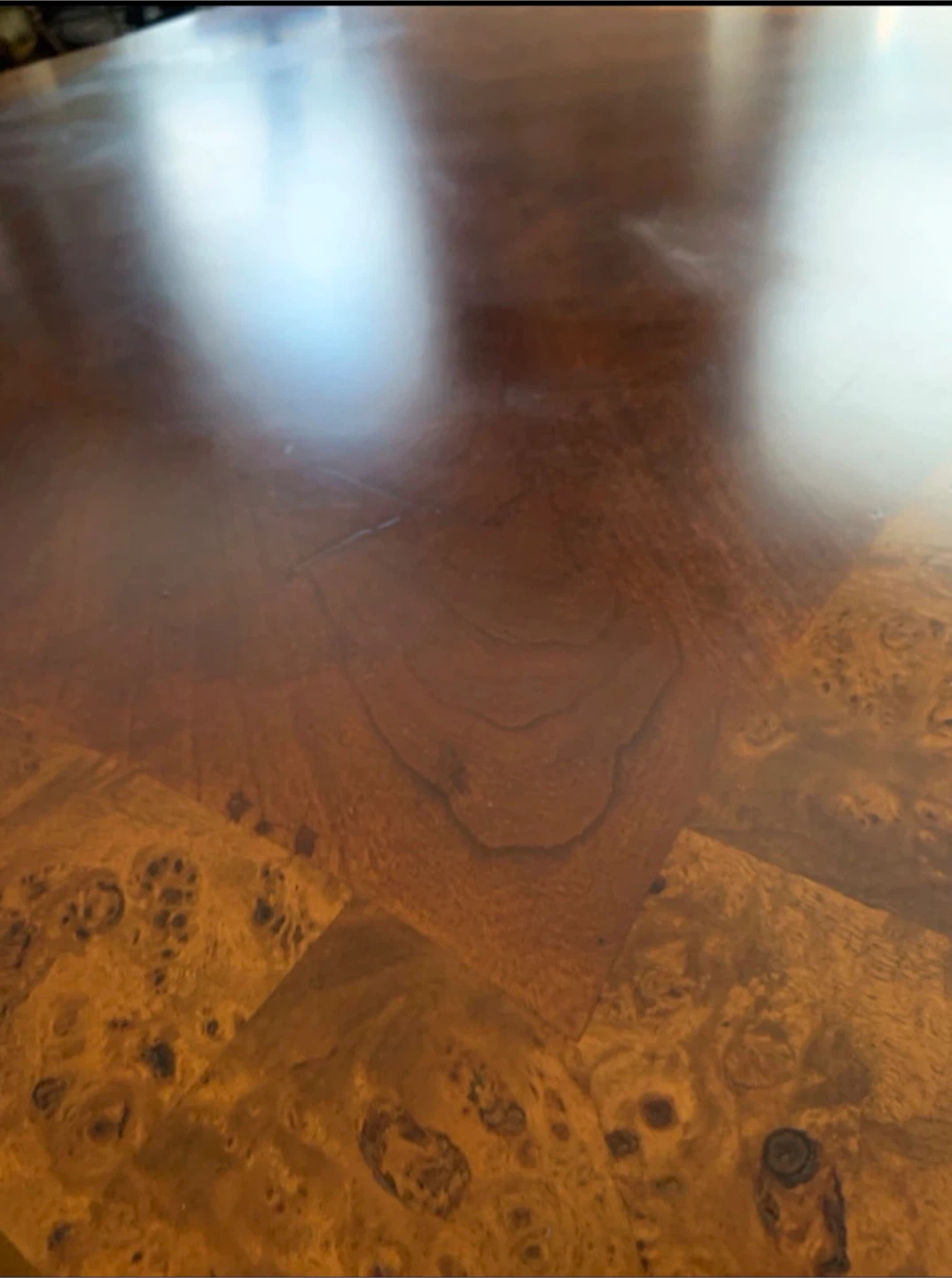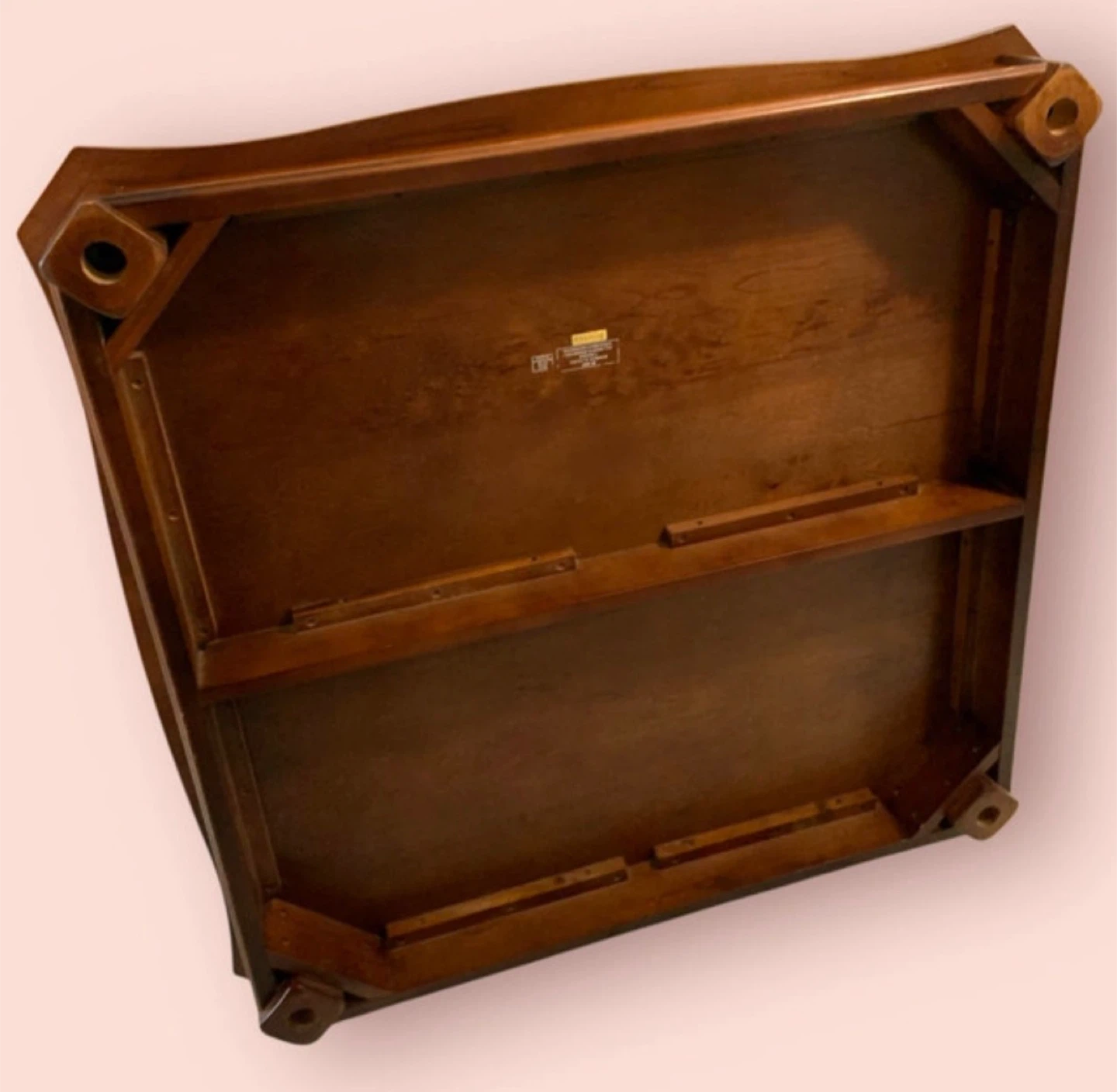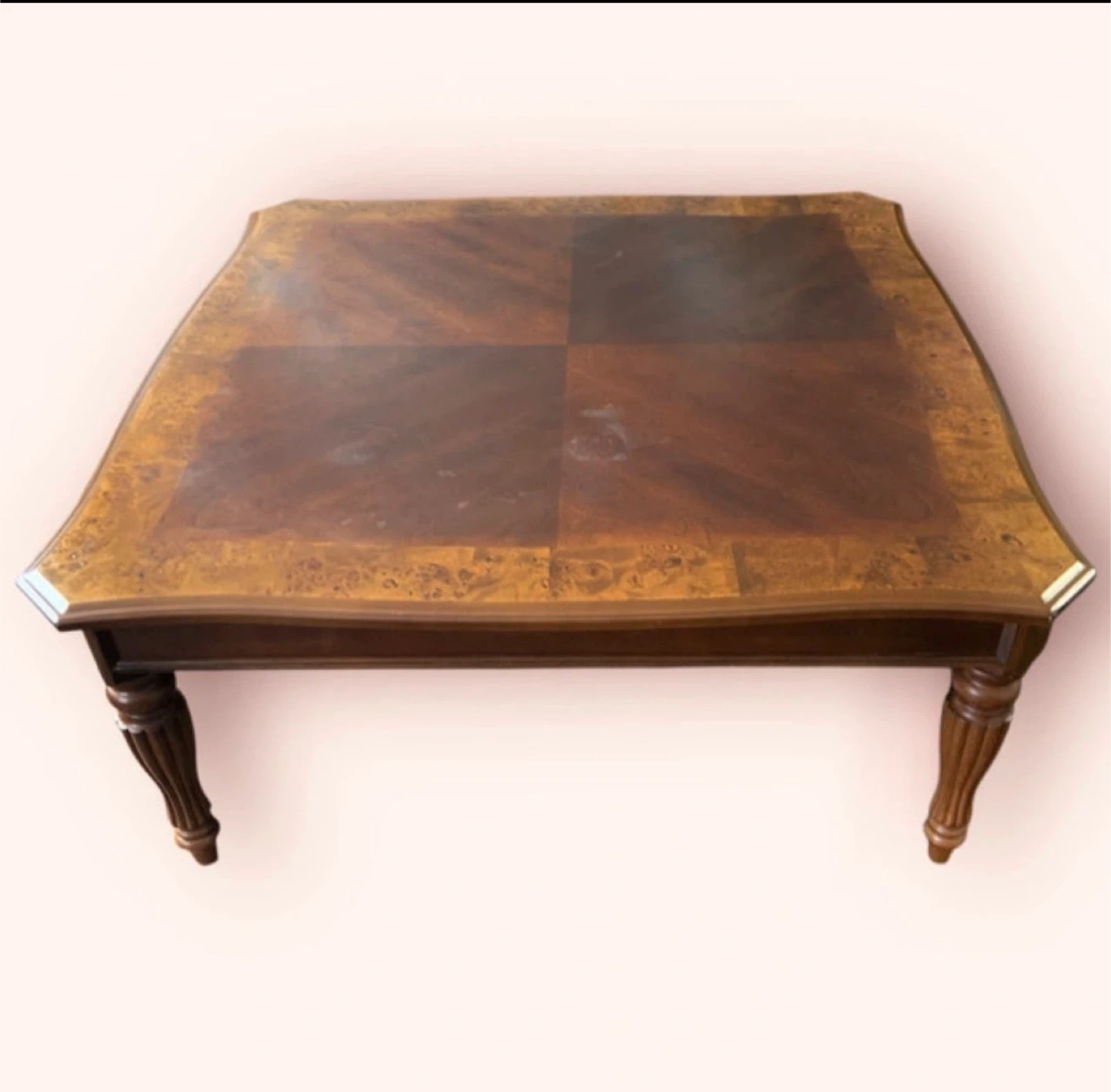 This is a square wood coffee table with detailed inlay. It features carved wooden legs and a durable finish. The table's generous surface area makes it suitable for living rooms. 40x40x18