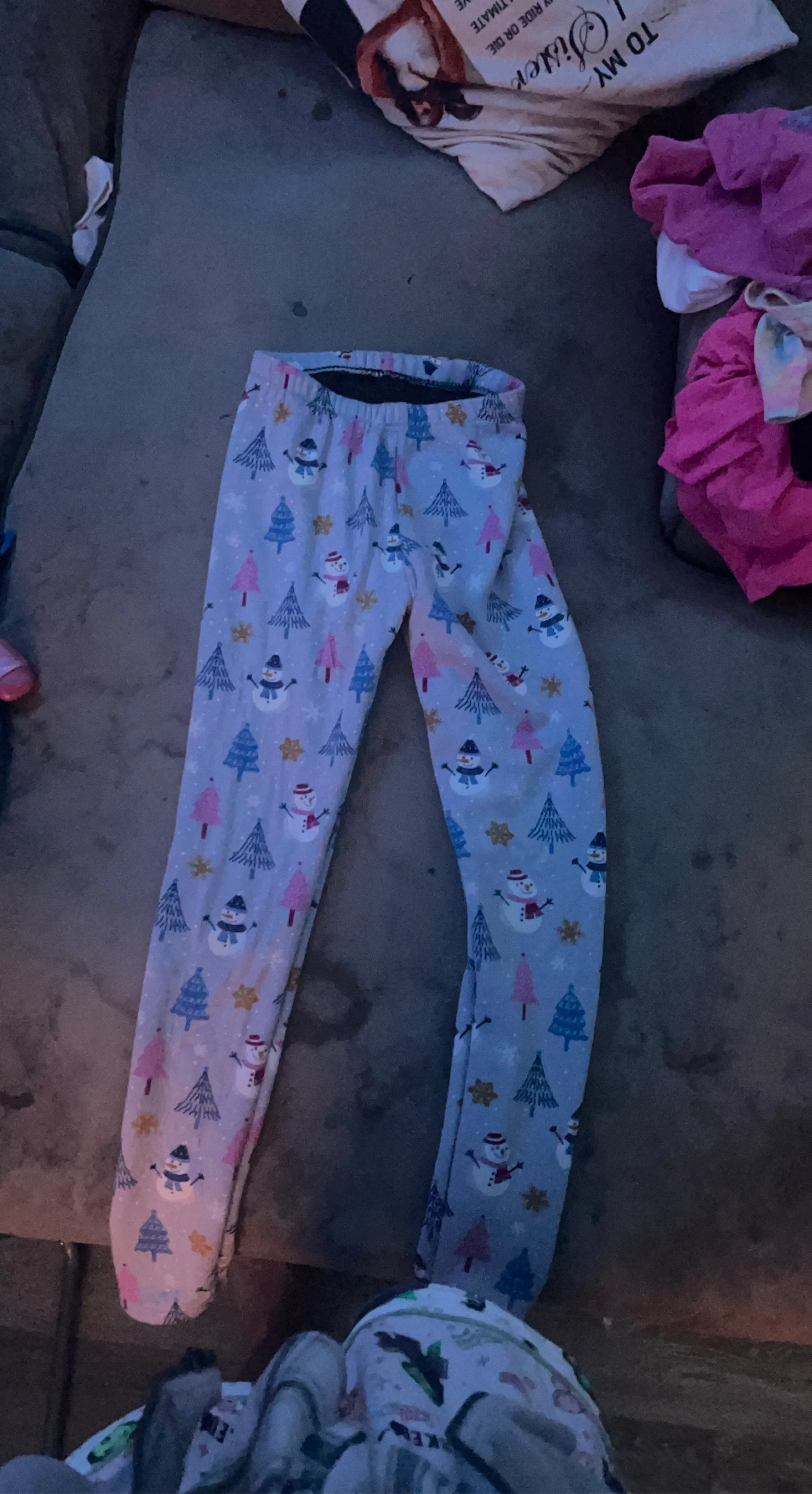 These girls' fuzzy winter pants feature a cute grey base with a pattern of snowmen, pine trees, and snowflakes. They have an elastic waistband for a comfy fit. Perfect for cozy days during the holiday season!