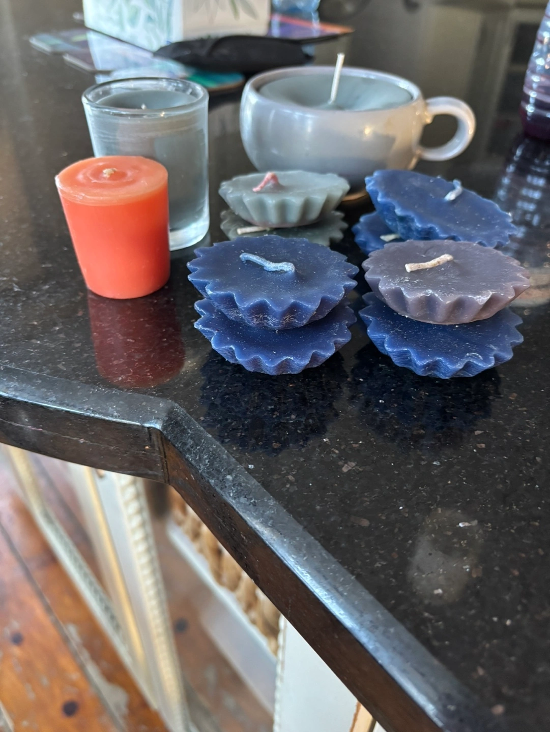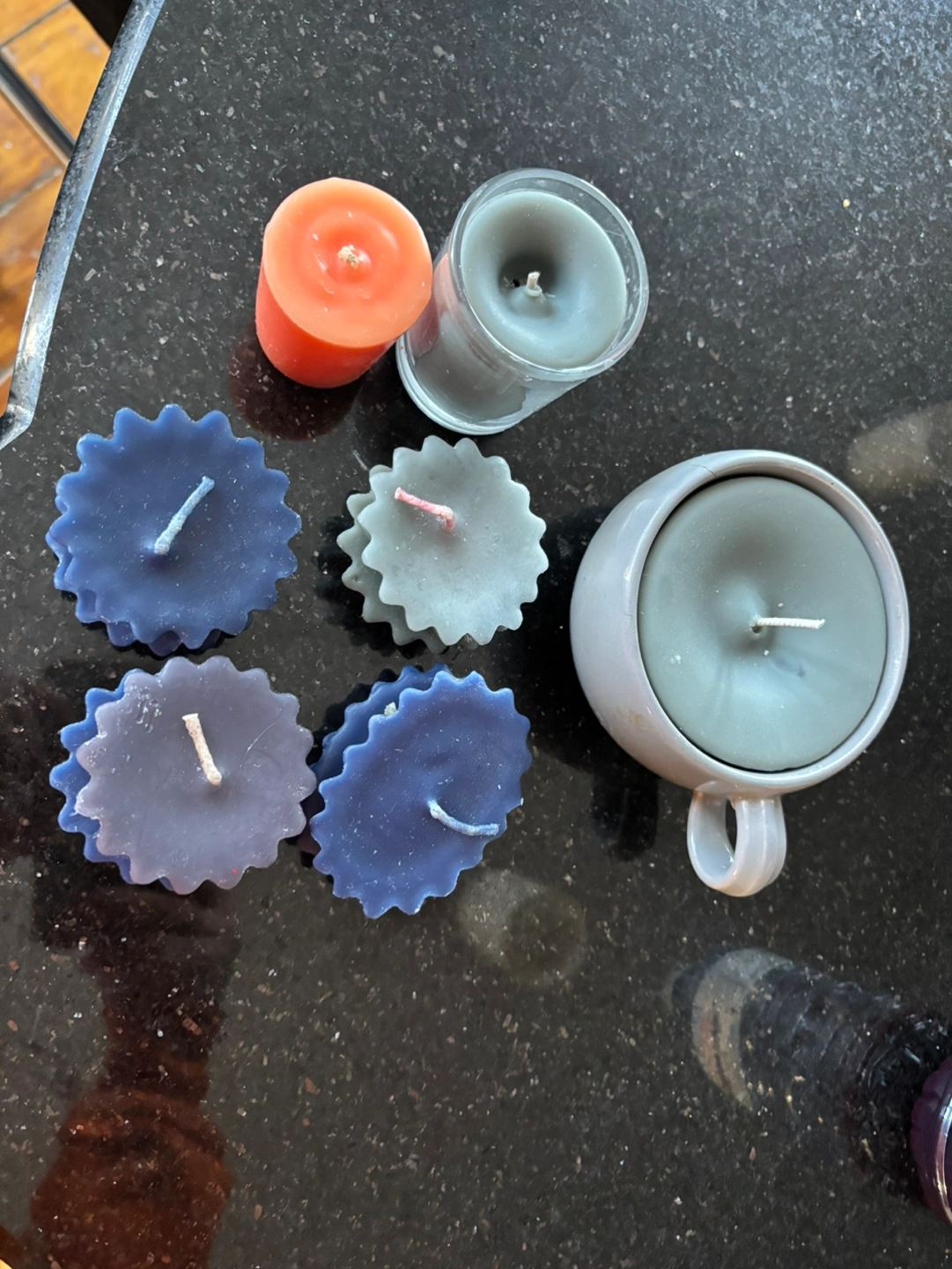 Collection of various sized and coloured candles. Includes tealight candles, votive candles, and a larger candle in a mug. Colours include coral, blue, and grey.