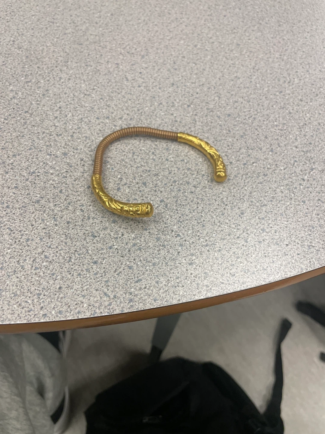 This is a gold-coloured bracelet with intricate carvings. It's a cuff style with a flexible, spring-like band in the middle. It's a unique accessory!