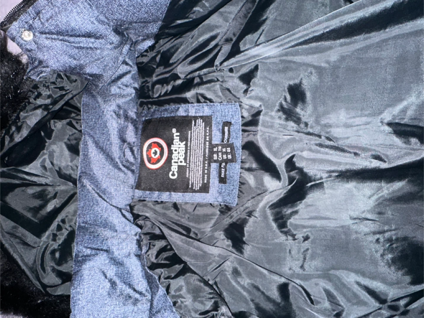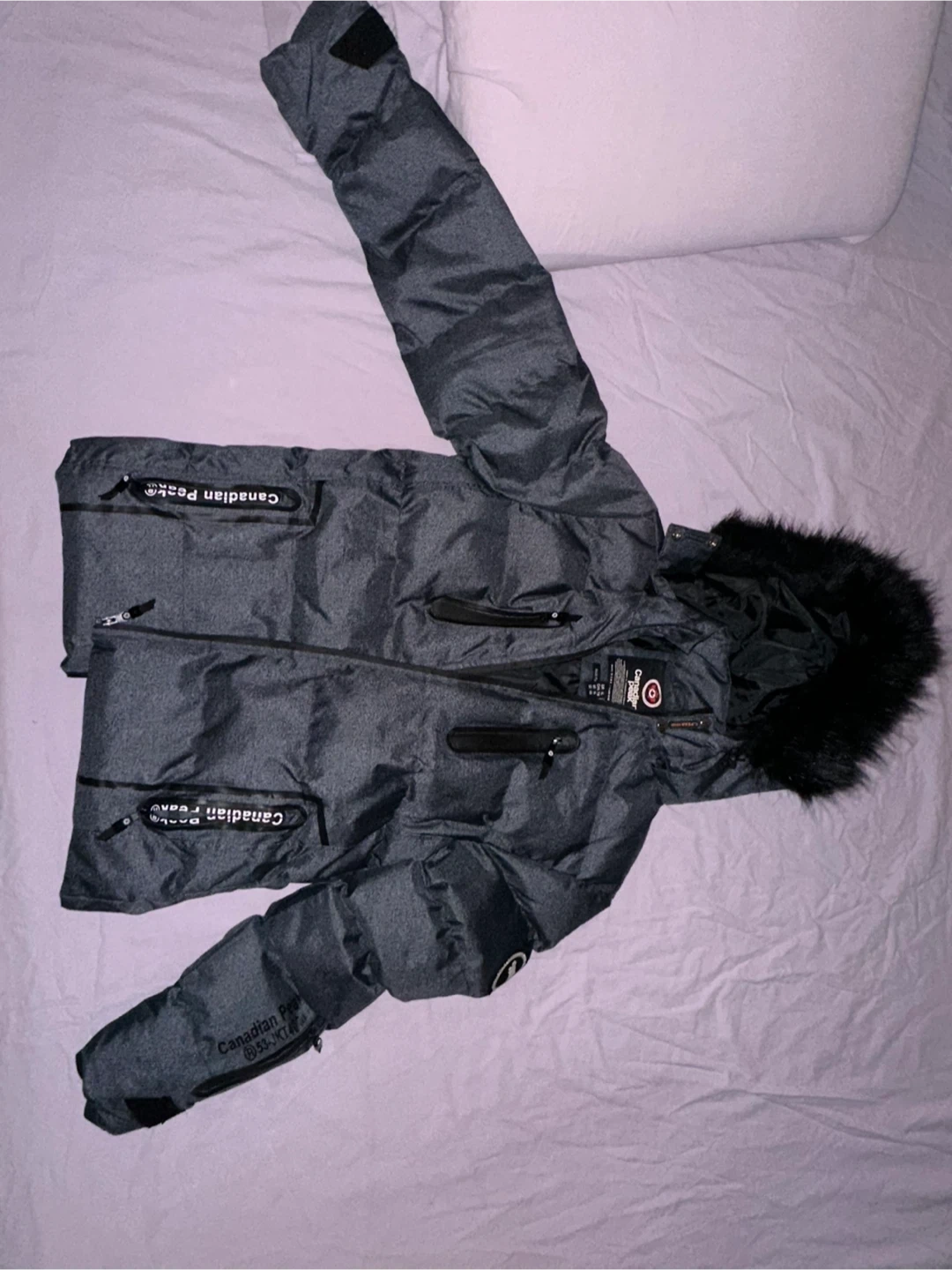 This Canadian Peak down jacket is grey with a black fur-lined hood. It's designed for cold weather protection. It's a size XL.