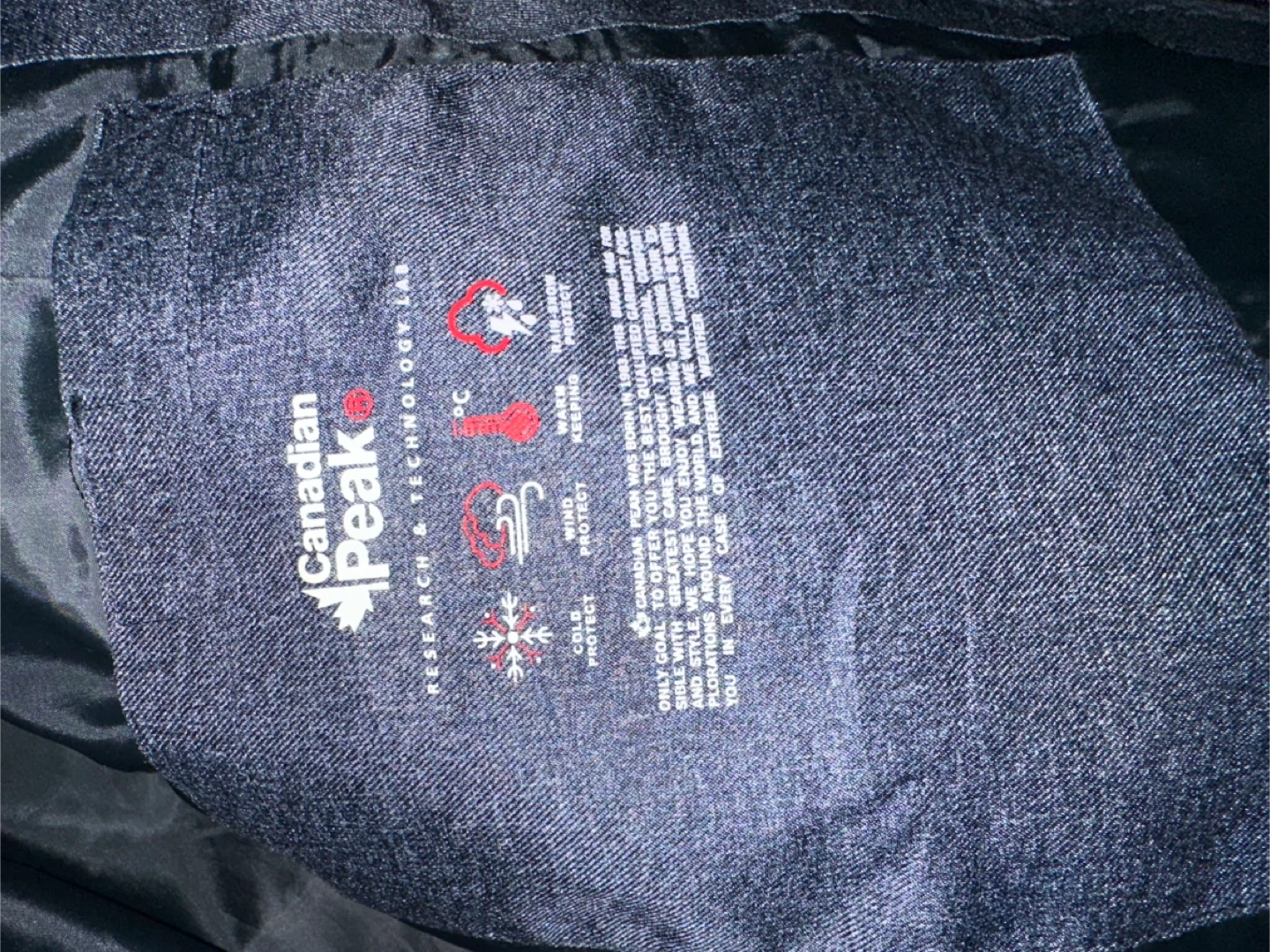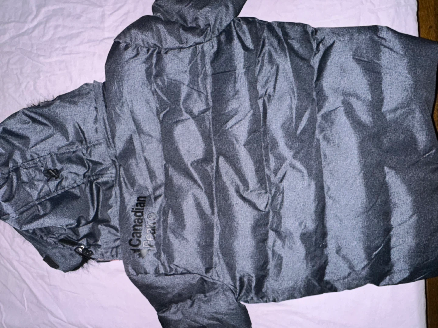 This Canadian Peak down jacket is grey with a black fur-lined hood. It's designed for cold weather protection. It's a size XL.