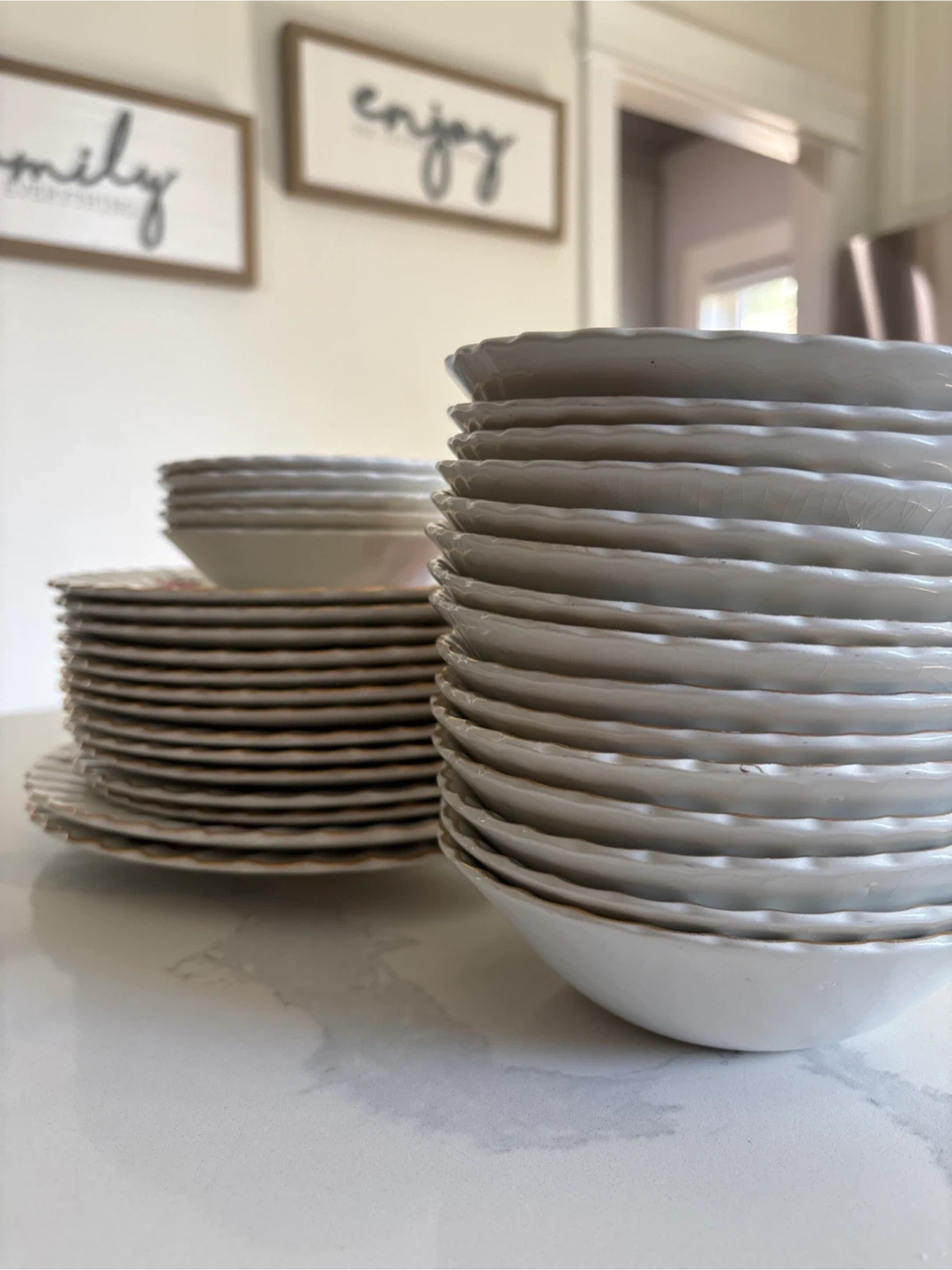 This set includes six Royal Albert dinner plates and six matching bowls. They feature a delicate rose pattern with gold trim. White ceramic material with scalloped edges. These pieces are great for special occasions or everyday elegance!