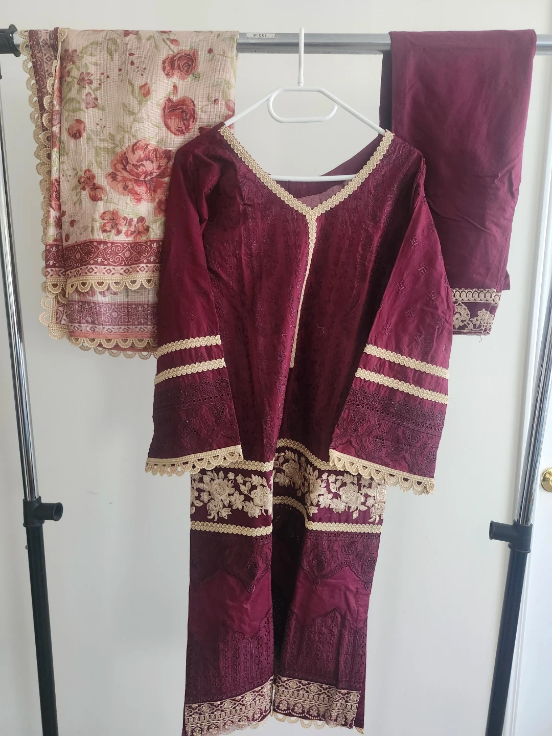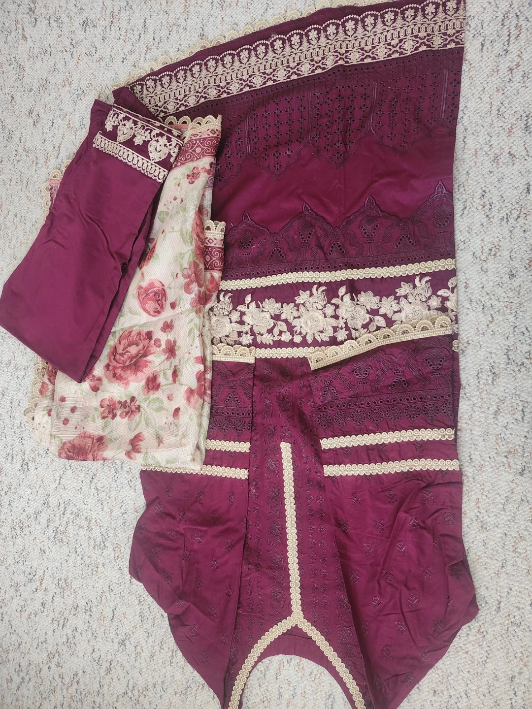 A beautiful three-piece unstitched women's suit featuring a maroon embroidered kurti. It comes with matching maroon pants and a floral net print dupatta. This outfit is perfect for festive occasions or cultural events.