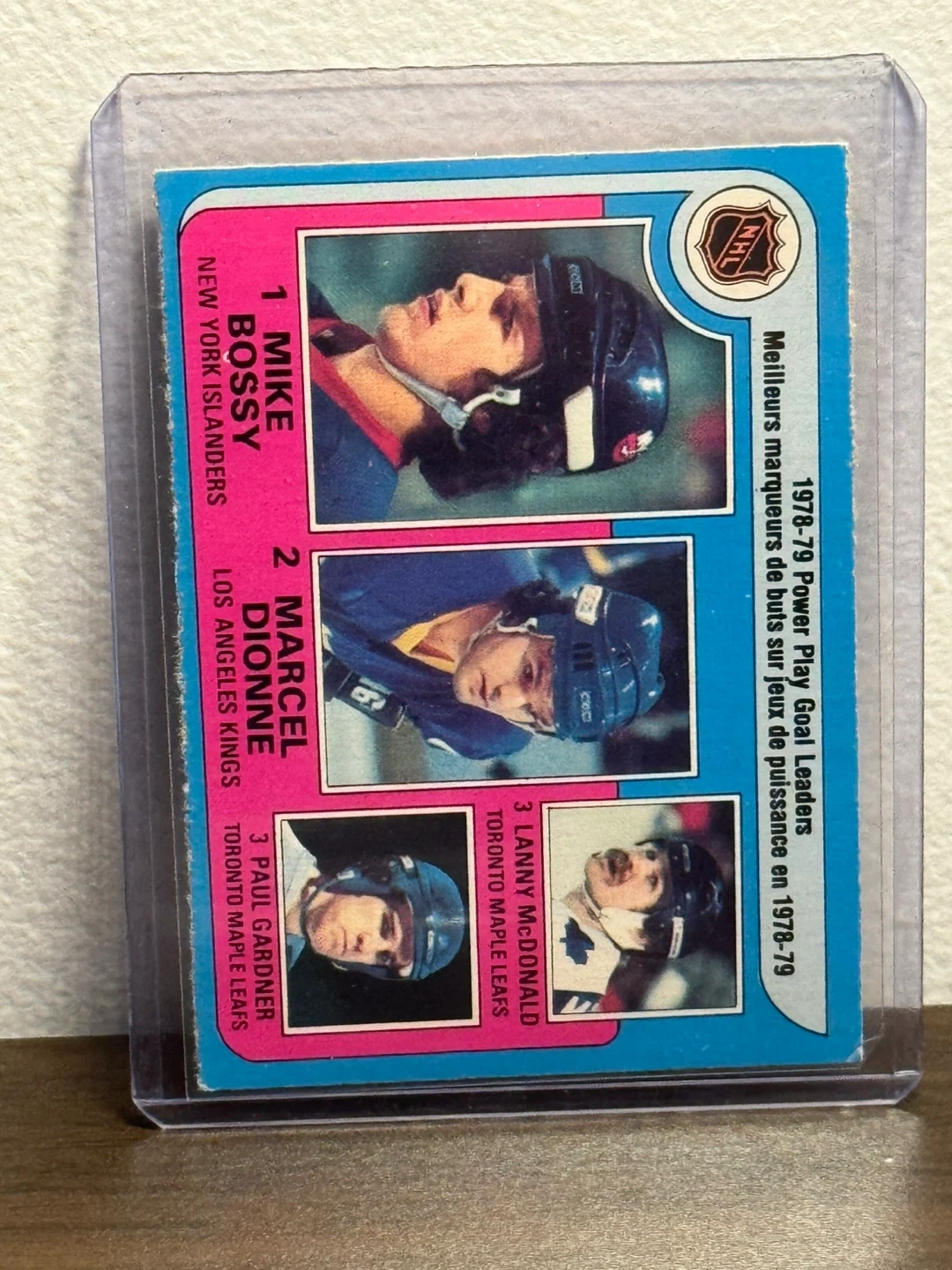 Selling a 1978-79 O-Pee-Chee NHL hockey card featuring Power Play Goal Leaders. The card highlights players like Mike Bossy, Marcel Dionne, and Lanny McDonald. A great addition for any hockey card collector!