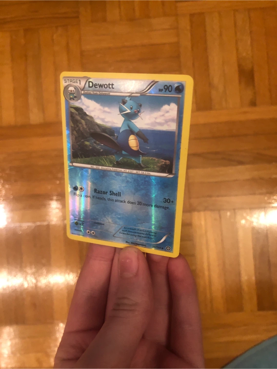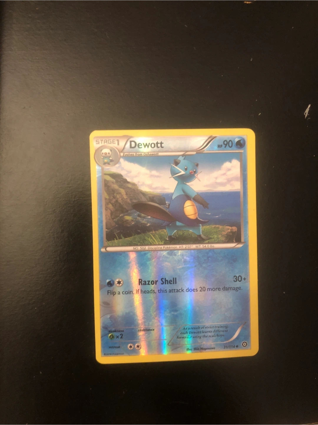 This is a Stage 1 Dewott trading card from Pokemon. It has 90 HP and the "Razor Shell" attack. The attack deals 30+ damage.
