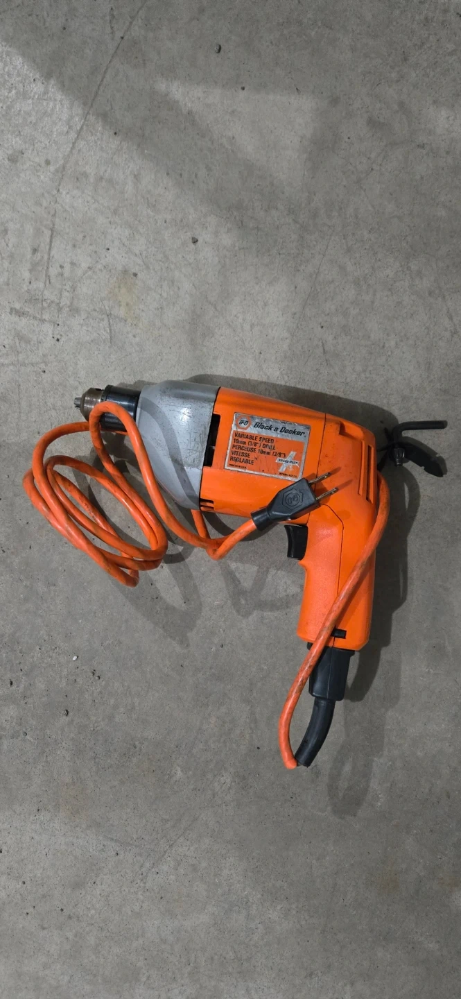 This is a Black & Decker variable speed drill. It has a 10mm (3/8") chuck size. It's ideal for various DIY tasks.