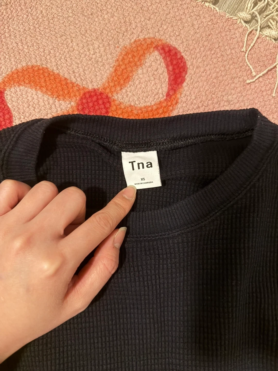 This is a black long sleeve thermal top from Tna. It's a size XS. The waffle knit material makes it comfy and warm.