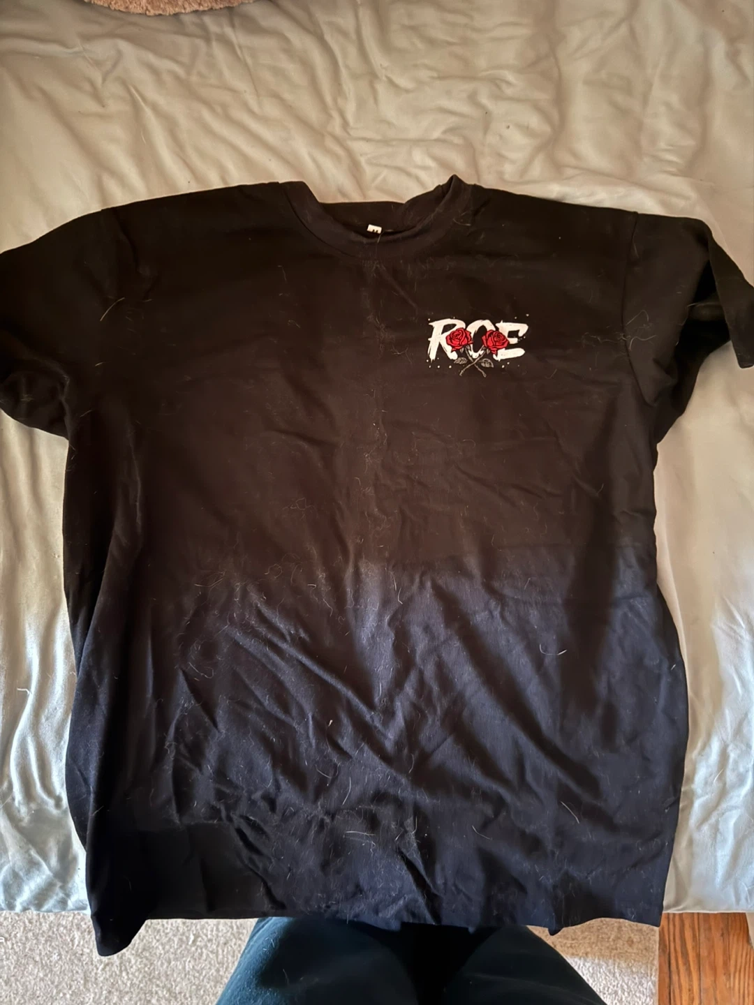 Black graphic t-shirt with "ROE" and a rose design on the front and "RESULTS OVER EXCUSES" on the back. Cotton material.