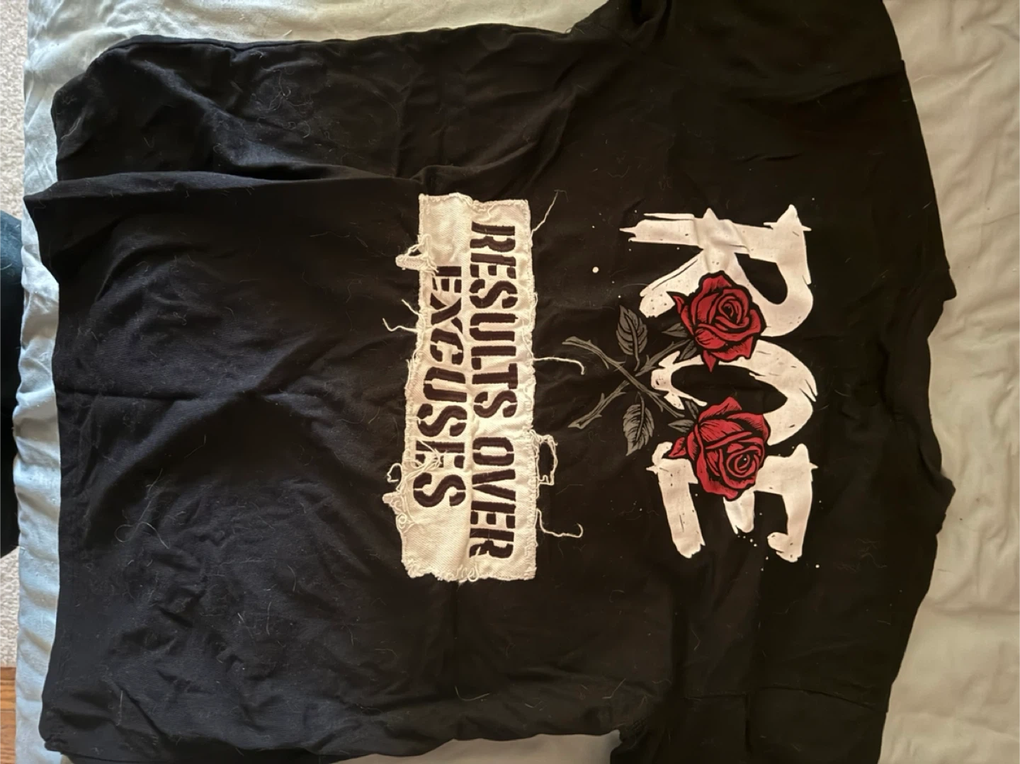Black graphic t-shirt with "ROE" and a rose design on the front and "RESULTS OVER EXCUSES" on the back. Cotton material.