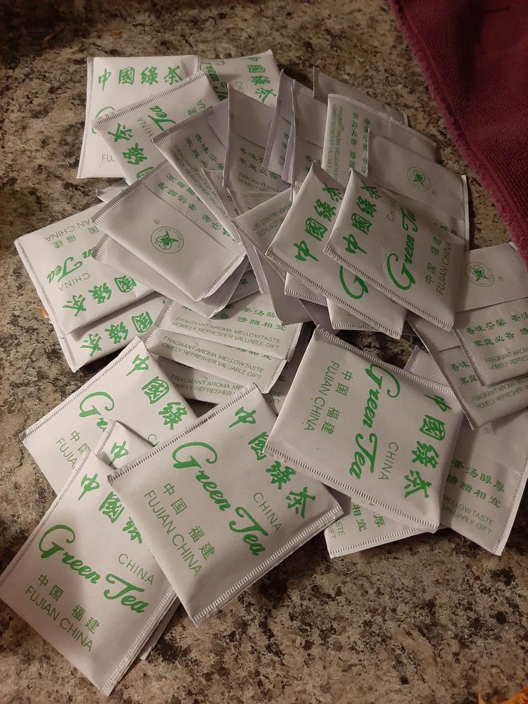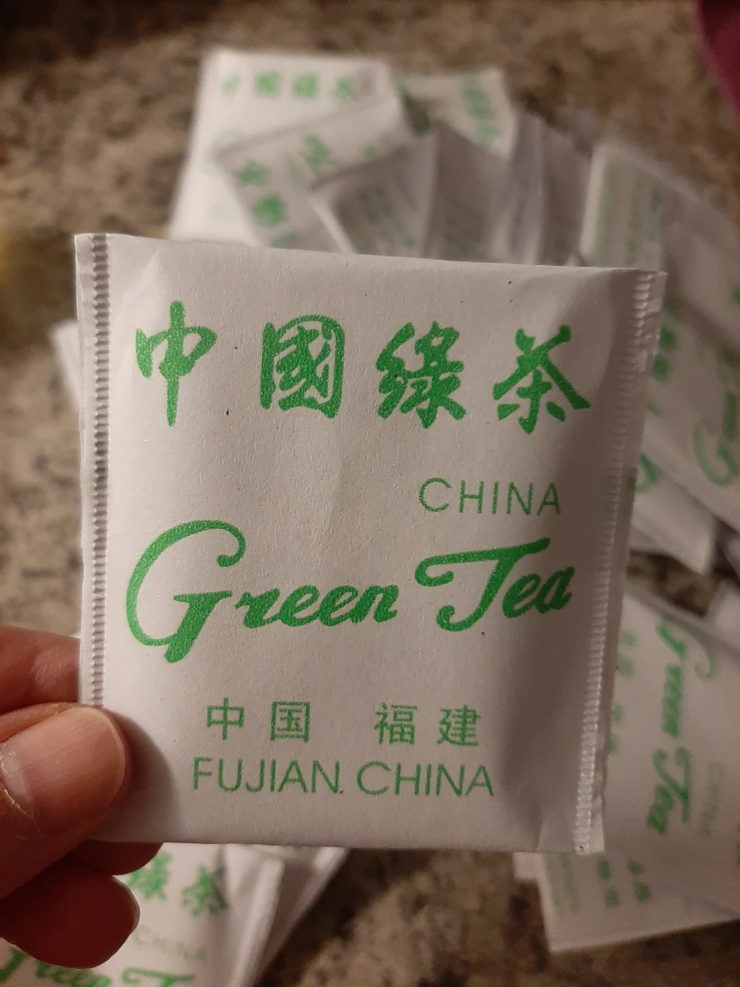 This is a collection of individually wrapped green tea bags from Fujian, China. Each bag contains green tea, offering a mellow taste and refreshing aroma. They're perfect for a quick cup of tea anytime.
