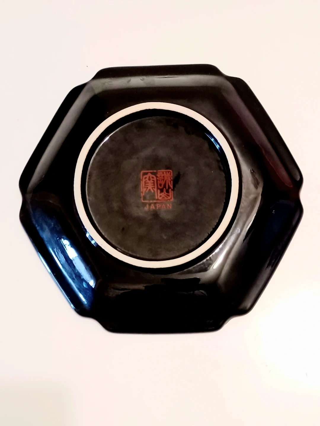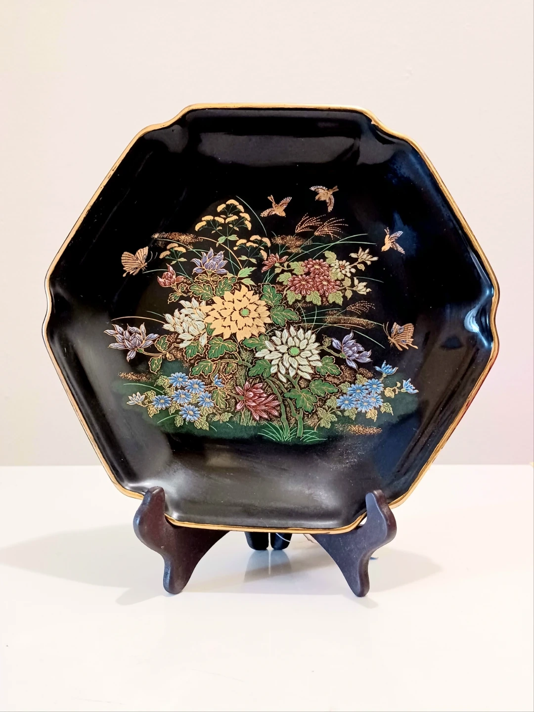 Vintage 1980s, Collectible Japanese Kenzan Gama Hexagonal Porcelain plate. Features a stunning Hand Painted Black Onyx porcelain and showcases a floral motif with butterflies and birds.