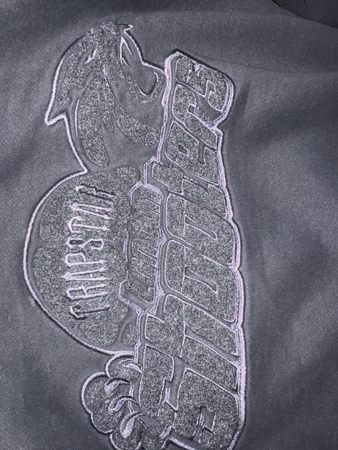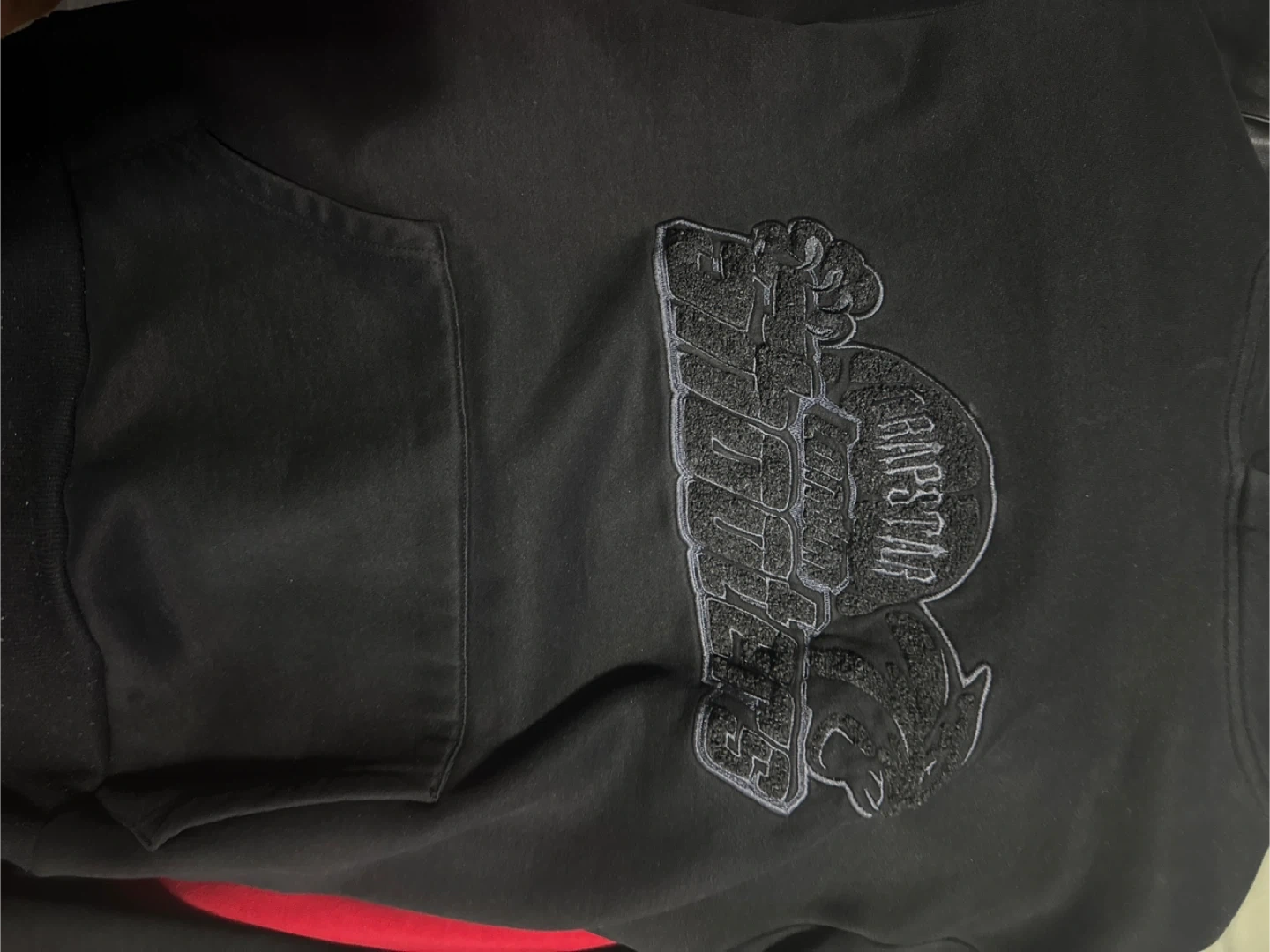 Black Trapstar hoodie with a chenille logo on the chest. It's a size medium. The fabric is a soft cotton blend. Pretty new selling because I don’t need reasonable price is 40